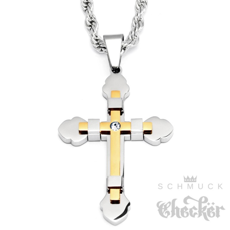 Ausgefallener Kreuz Anhänger silber & gold mit Zirkonia Herren Edelstahl Halskette