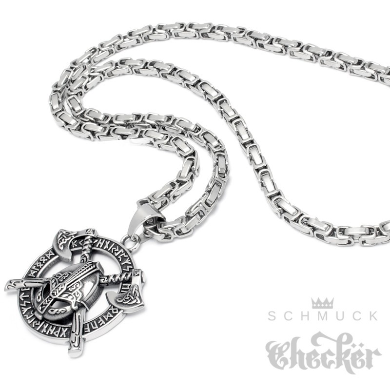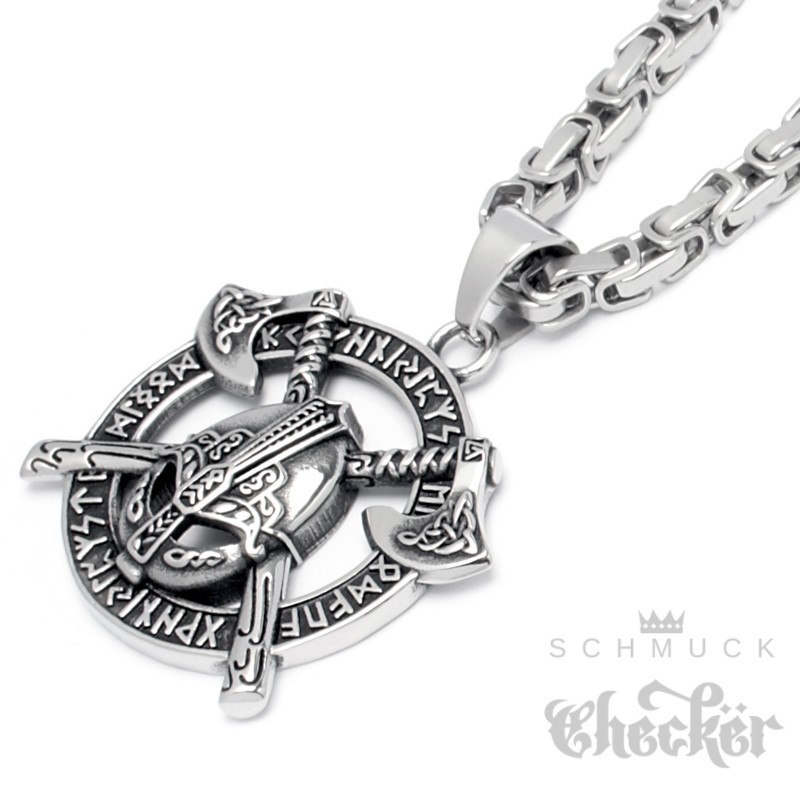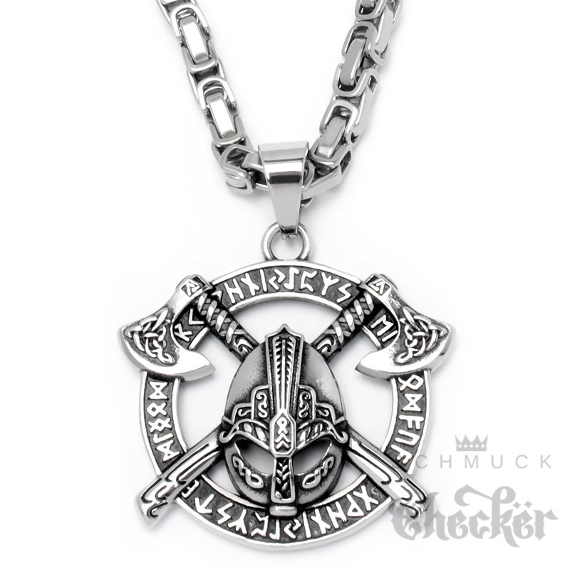 Berserker Anhänger Wikingerhelm Streitäxte Runen-Kranz Edelstahl Kette Königskette
