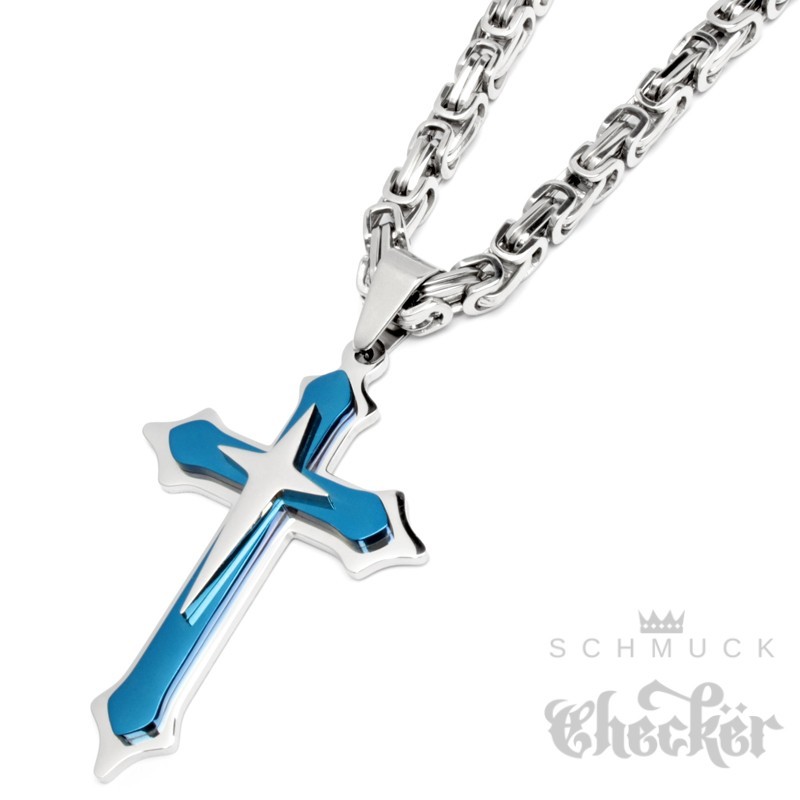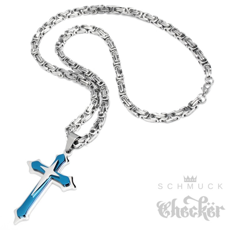 Blaues Kreuz mit Halskette aus Edelstahl Herren Schmuck Geschenk silber Königskette