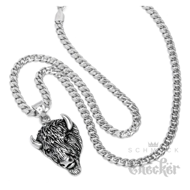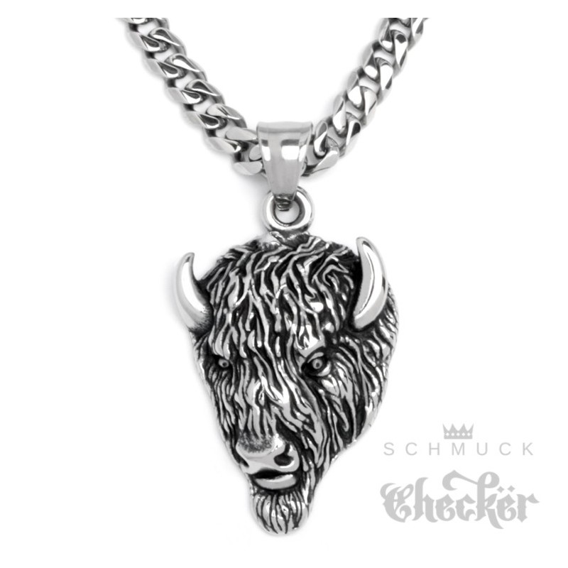 Edelstahl Anhänger Bison Büffel Buffalo Wisent Halskette Panzerkette Indianer Bikerschmuck