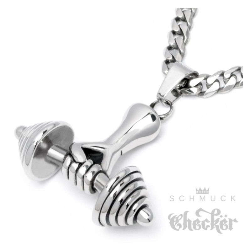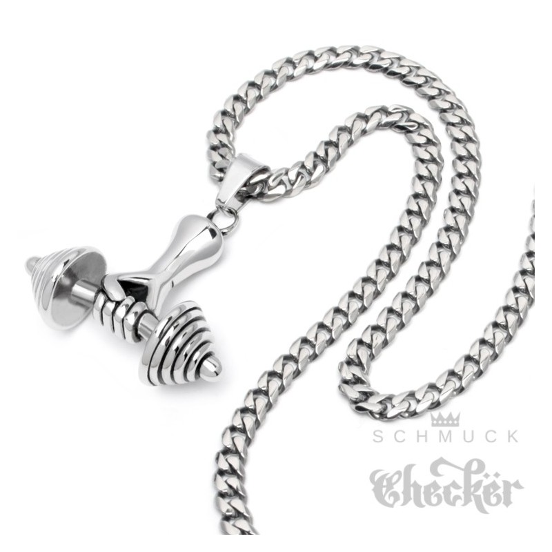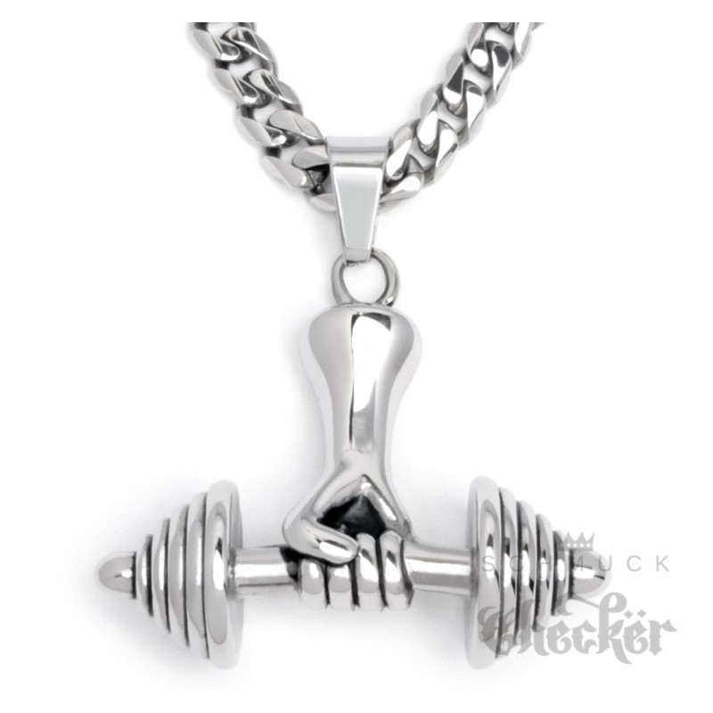 Starke Hand die eine schwere Hantel hält als Anhänger aus Edelstahl. Der Männerschmuck zeigt eine Hantel mit konisch aufgeschichteten Gewichten die einige Kilos geladen hat. Passend zum Anhänger gibt’s eine Panzerkette mit 60cm Länge. Perfekter Schmuck für Fitnessfanatiker, Bodybuilder und alle die auf Krafttraining stehen. Tolle Geschenkidee für muskulöse Männer.