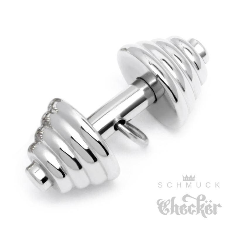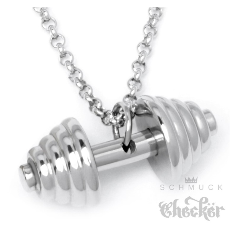 Hochwertiger Hantel Anhänger aus Edelstahl mit passender Kette. Der silberne Männerschmuck zeigt eine Hantel mit konisch aufgeschichteten Gewichten. Perfekter Schmuck für Fitnessfanatiker, Bodybuilder und alle die auf Krafttraining stehen. Tolle Geschenkidee für Männer.