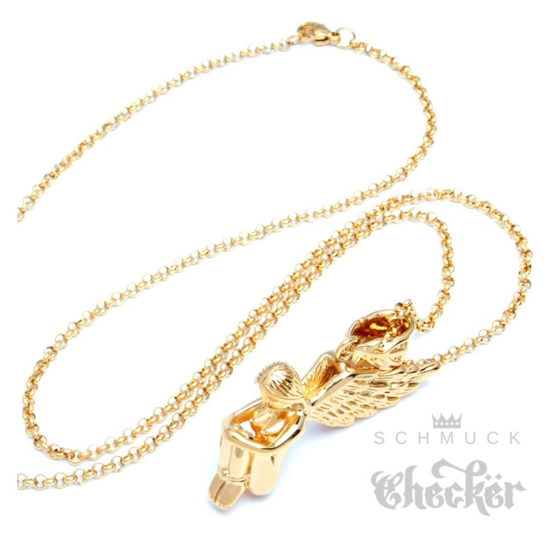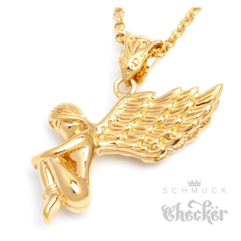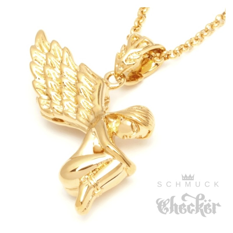 Hochwertiger Engels-Anhänger aus Edelstahl jetzt kaufen. Dieser detaillierte und hochwertig verarbeitete Anhänger stellt einen nackten Engel mit großen Flügeln dar. Die Beine des traurigen Engels sind gefesselt. Ein schöner Anhänger mit sehr viel symbolischer Kraft. Der goldene Anhänger kommt zusammen mit einer passenden Halskette mit 60cm Länge.