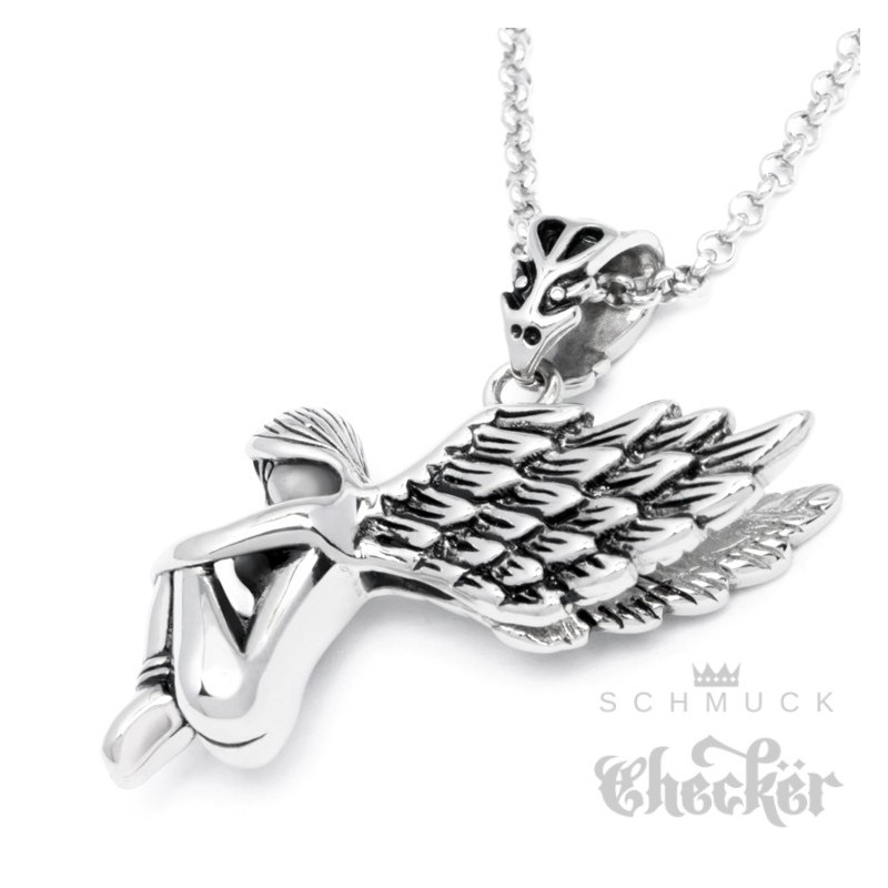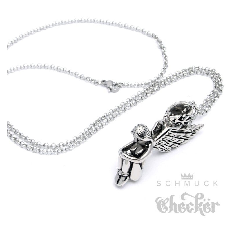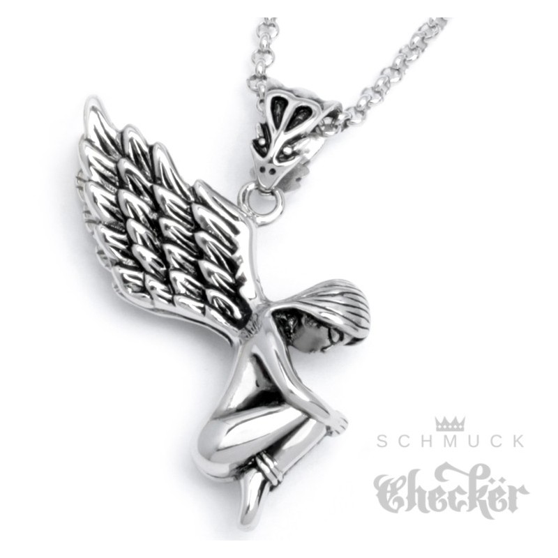 Hochwertiger Engels-Anhänger aus Edelstahl jetzt kaufen. Dieser detaillierte und hochwertig verarbeitete Anhänger stellt einen nackten Engel mit großen Flügeln dar. Die Beine des traurigen Engels sind gefesselt. Ein schöner Anhänger mit sehr viel symbolischer Kraft. Der silberfarbene Anhänger kommt zusammen mit einer passenden Halskette mit 60cm Länge.