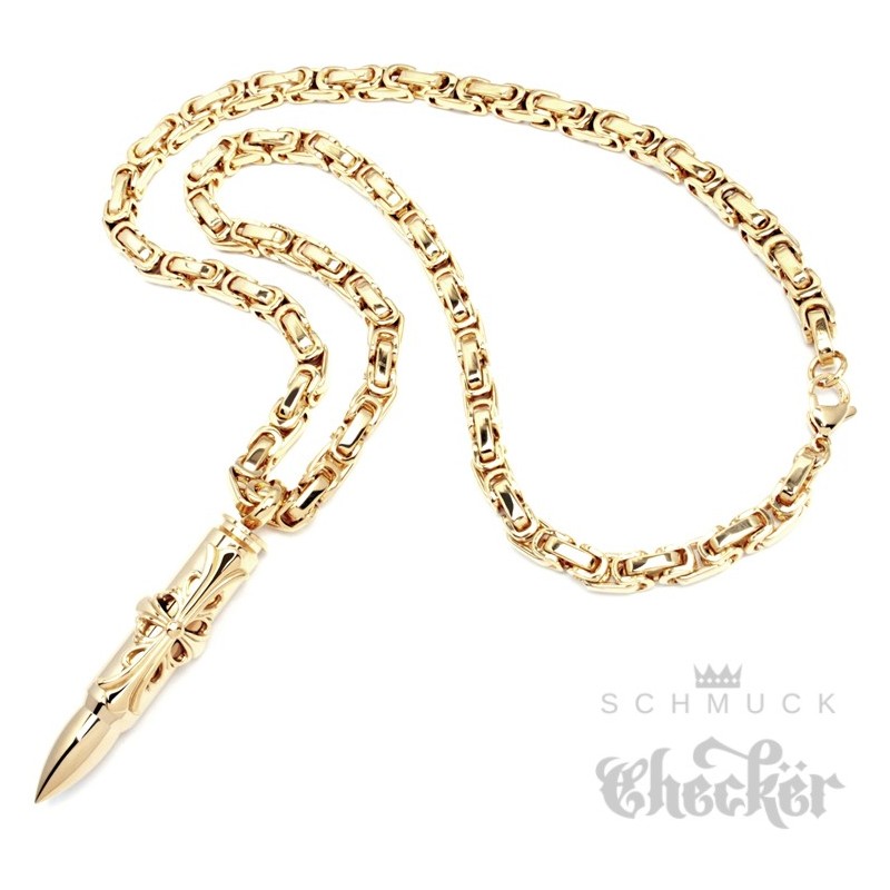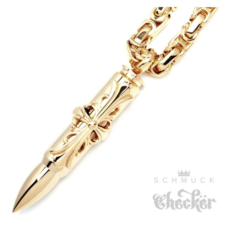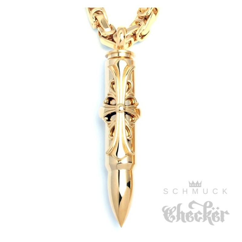 Goldener Herrenschmuck bestehend aus Königskette mit Anhänger. Die goldene Patrone ist hochwertig verarbeitet und wird durch ein prächtiges Kreuz verziert. Die passende Halskette ist 60cm lang, kann auf Wunsch aber gekürzt werden. Ein perfektes Geschenk für Männer mit Waffenaffinität.