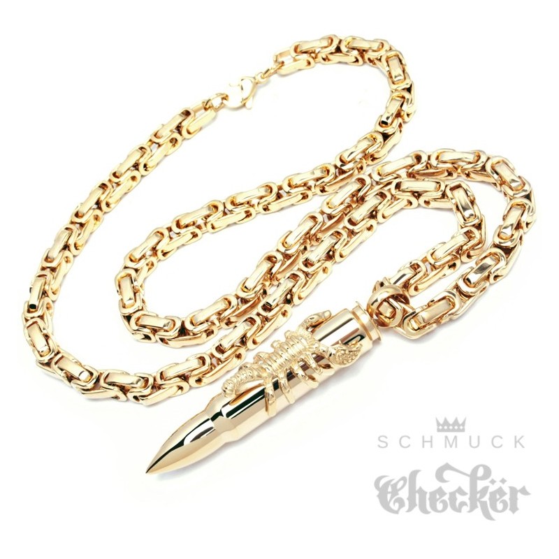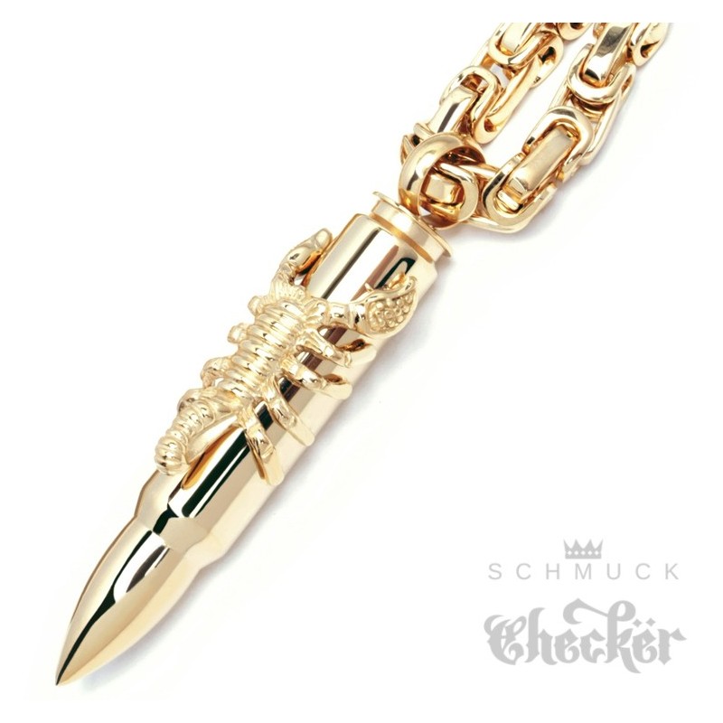 Goldener Herrenschmuck bestehend aus Königskette mit Bullet-Anhänger. Die goldene Patrone ist hochwertig verarbeitet und wird durch einen prächtigen Skorpion verziert. Die passende Halskette ist 60cm lang, kann auf Wunsch aber gekürzt werden. Ein perfektes Geschenk für Männer mit Waffenaffinität.