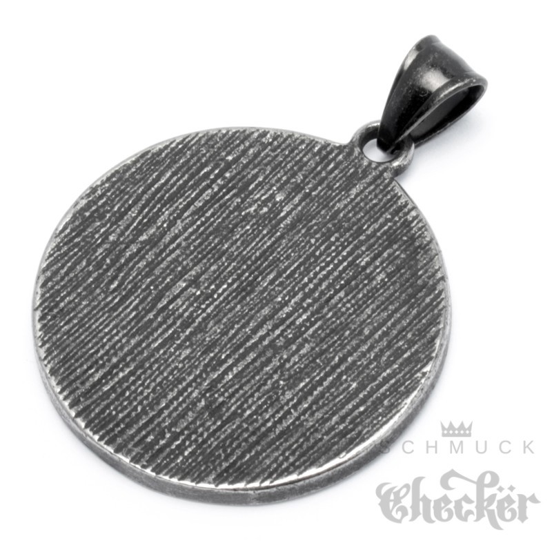 - Der Anhänger hat ein paar kleine, gewollte Macken und eine grau-matte Färbung (optisch ähnlich dem brünieren von Feuerwaffen) um diesen sehr geilen rustikalen Look zu bekommen. Dadurch ist das Schmuckstück auch sehr unanfällig für Macken und Kratzer, da sich diese gut in die Optik integrieren.