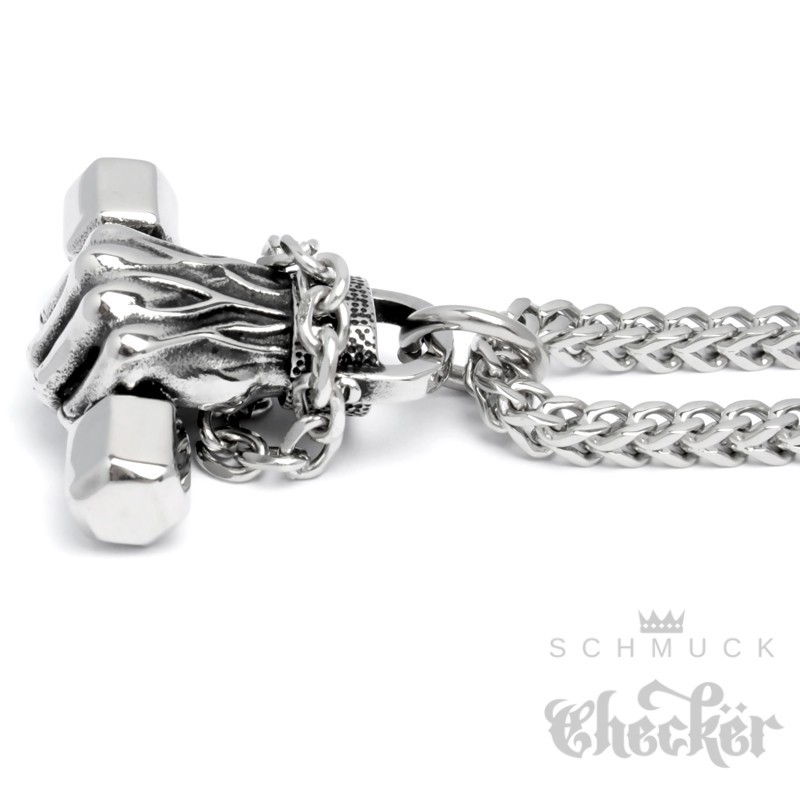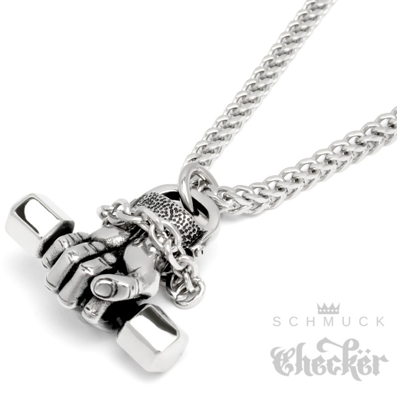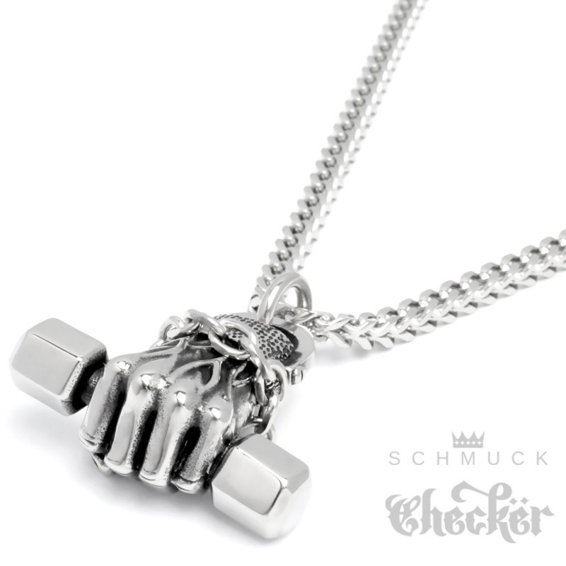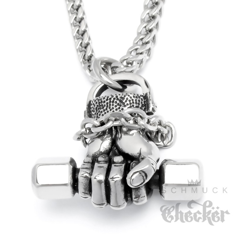 Hand mit Hantel Anhänger aus 316L Edelstahl Bodybuilder Kraftsport Motivation Kette