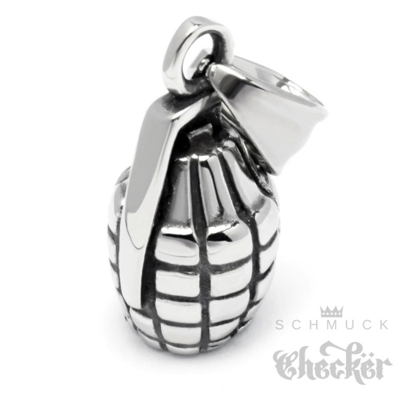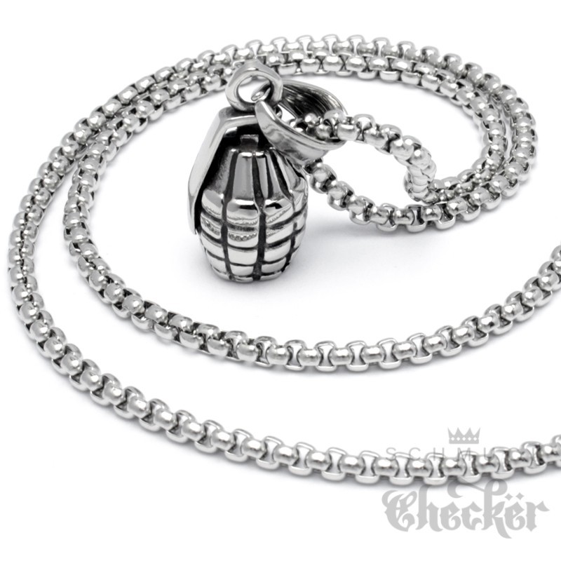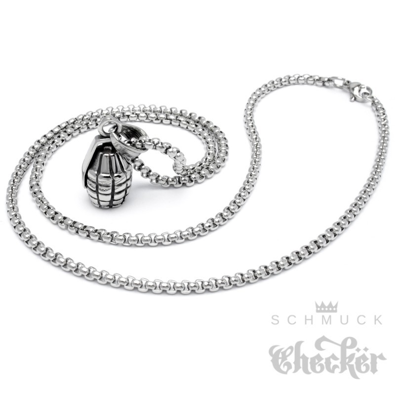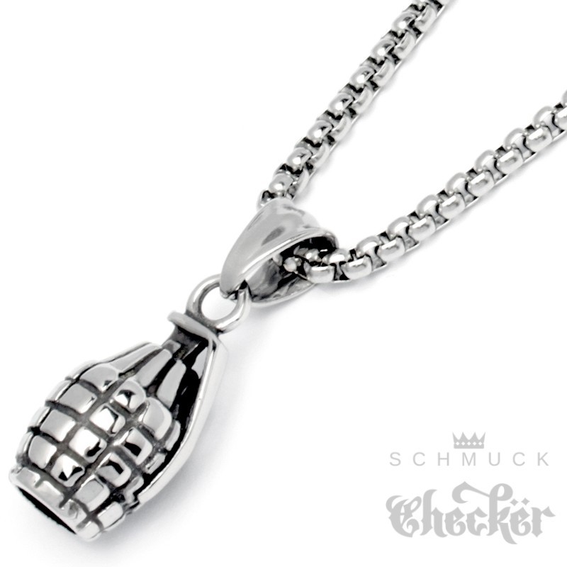 Handgranate Anhänger aus Edelstahl mit Halskette silber Herren-Schmuck 3D Granate