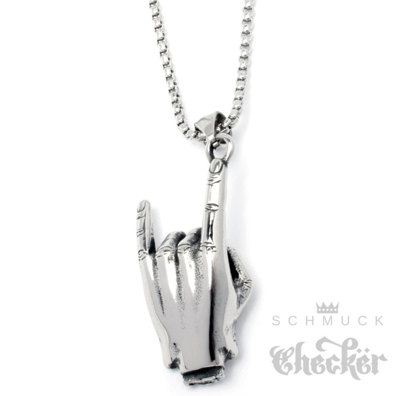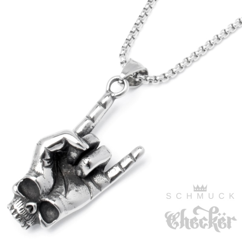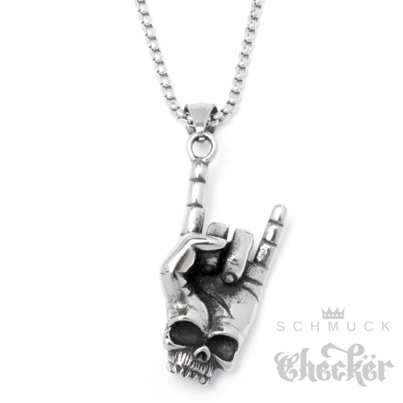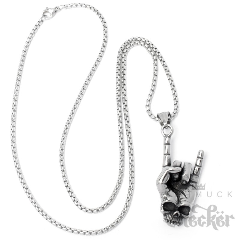 Heavy Metal Hand mit Skull Devil Horns Pommesgabel Mano Cornut Edelstahl Halskette