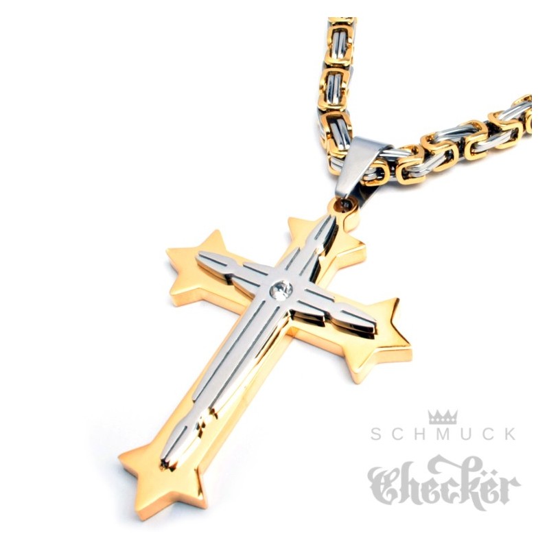 Herren Edelstahl Halskette Kreuz Anhänger silber & gold Zirkon + 60cm Königskette