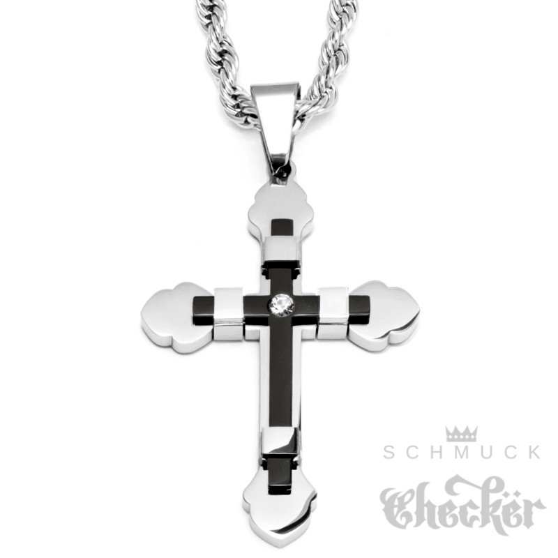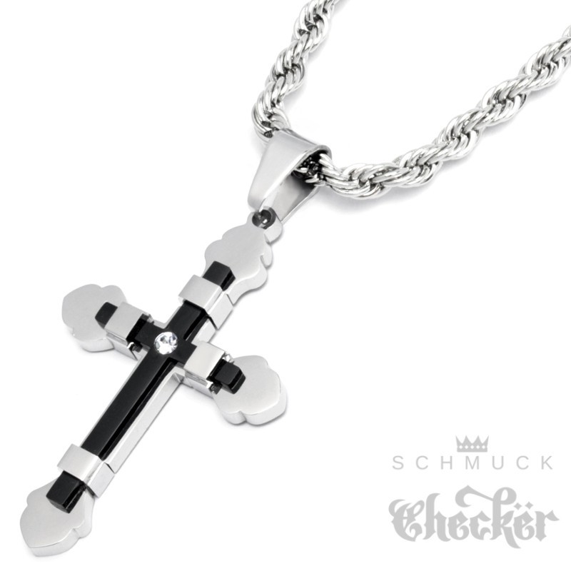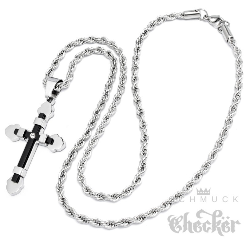 Kreuz Anhänger silber & schwarz mit echtem Zirkon Kordelkette Herren Edelstahl Kette