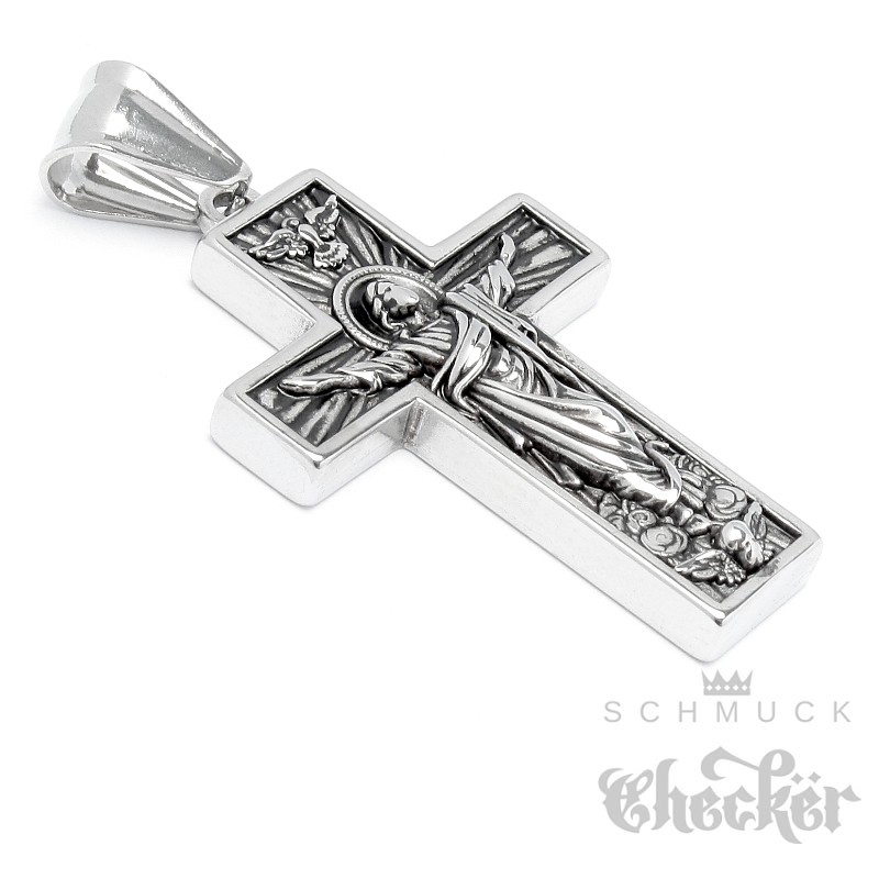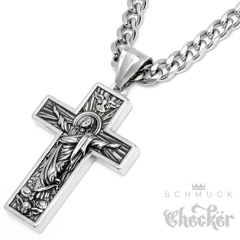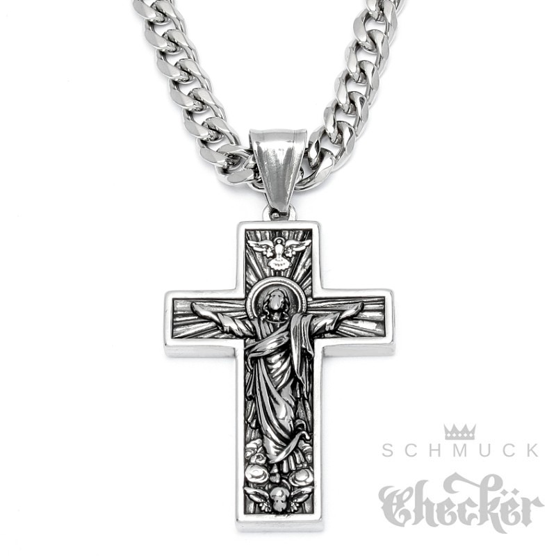 Kreuz mit Jesus und Friedenstaube sehr detaillierter Kreuzanhänger aus Edelstahl