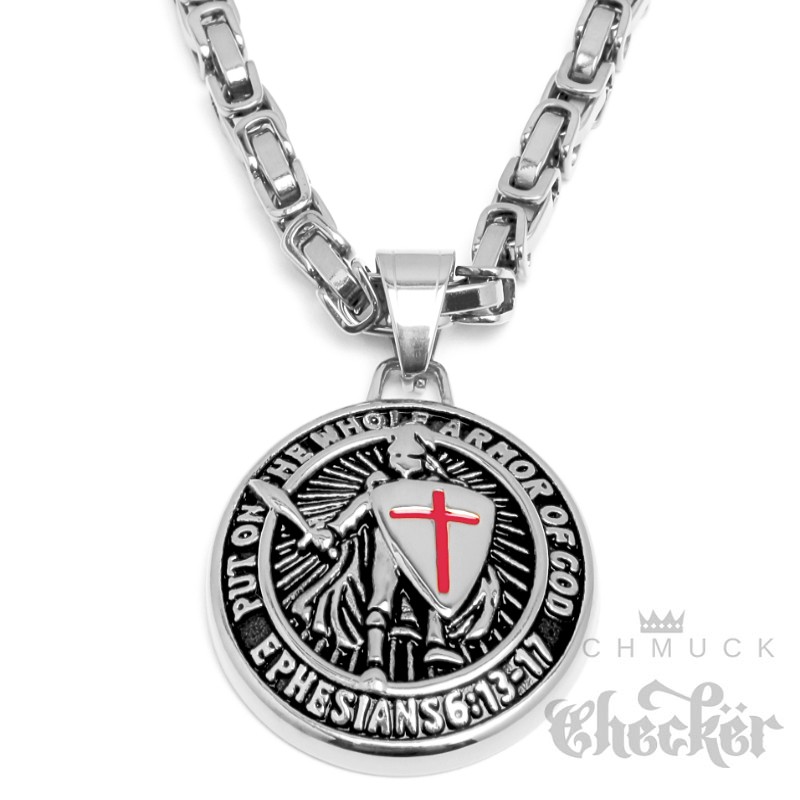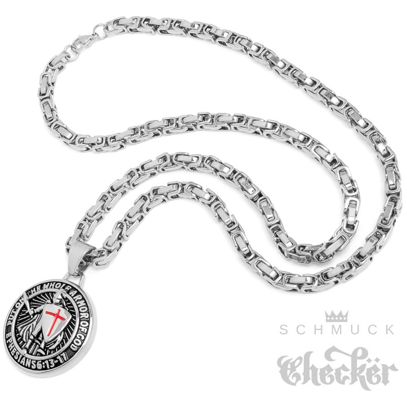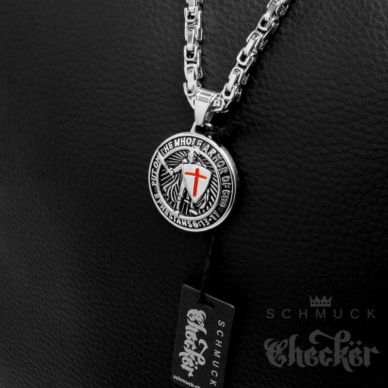 Kreuzritter-Amulett mit Bibelvers 6:13-17 rotes Kreuz Edelstahl poliert Halskette
