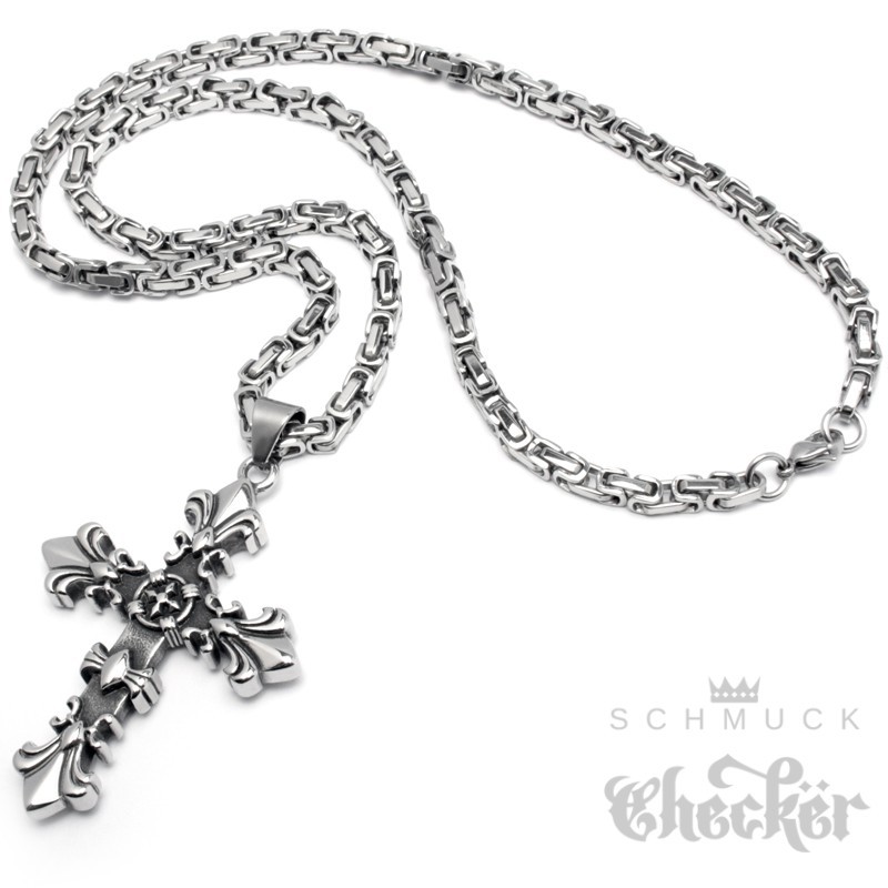 Hochwertiges und massives Kreuz, das an jedem Ende mit einer detaillierten heraldischen Lilie verziert ist. Der Anhänger wird durch eine passende Halskette im Byzantiner-Stil komplettiert. Das robuste Schmuckstück besteht aus massivem Edelstahl mit allen Vorzügen und hat eine hochglanzpolierte Oberfläche. Vertiefungen sind geschickt geschwärzt um die feinen Formen maximal hervorzuheben. Mit 26,8 Gramm hat das Kreuz ein gutes Gewicht, dass die Wertigkeit noch weiter unterstreicht. Maße von Halskette und Anhänger machen das Schmuckset zu echtem Männerschmuck. Liebhaber von leichtem, dünnen oder feinen Schmuck, raten wir hiervon ab.