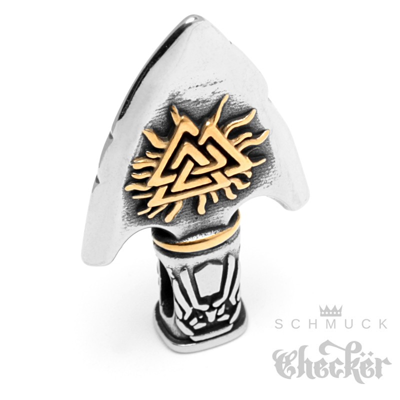 - Motiv: Spitze von Odins Speer, verziert mit Valknut auf einer Seite und Vegvisir auf der anderen Seite