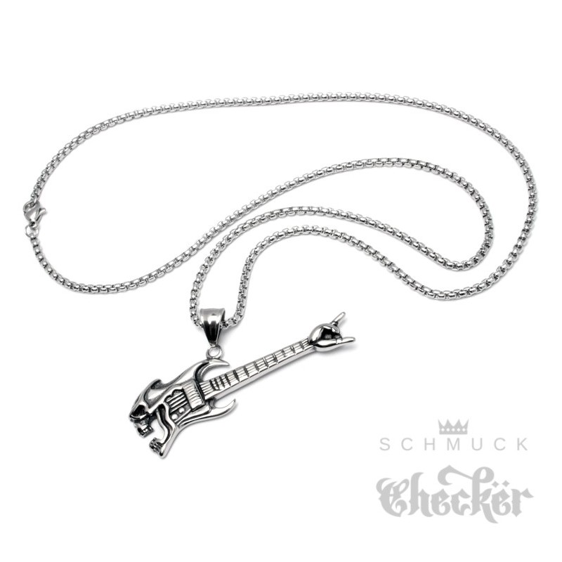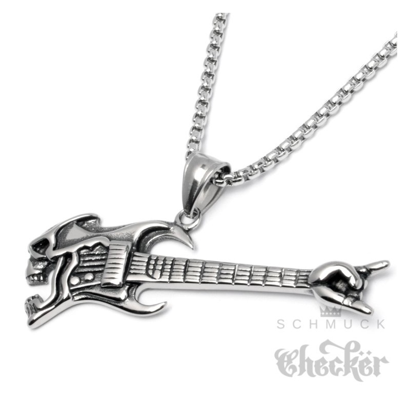 Rock Gitarre mit Totenkopf als Edelstahl Anhänger mit Halskette Skull Rockerschmuck