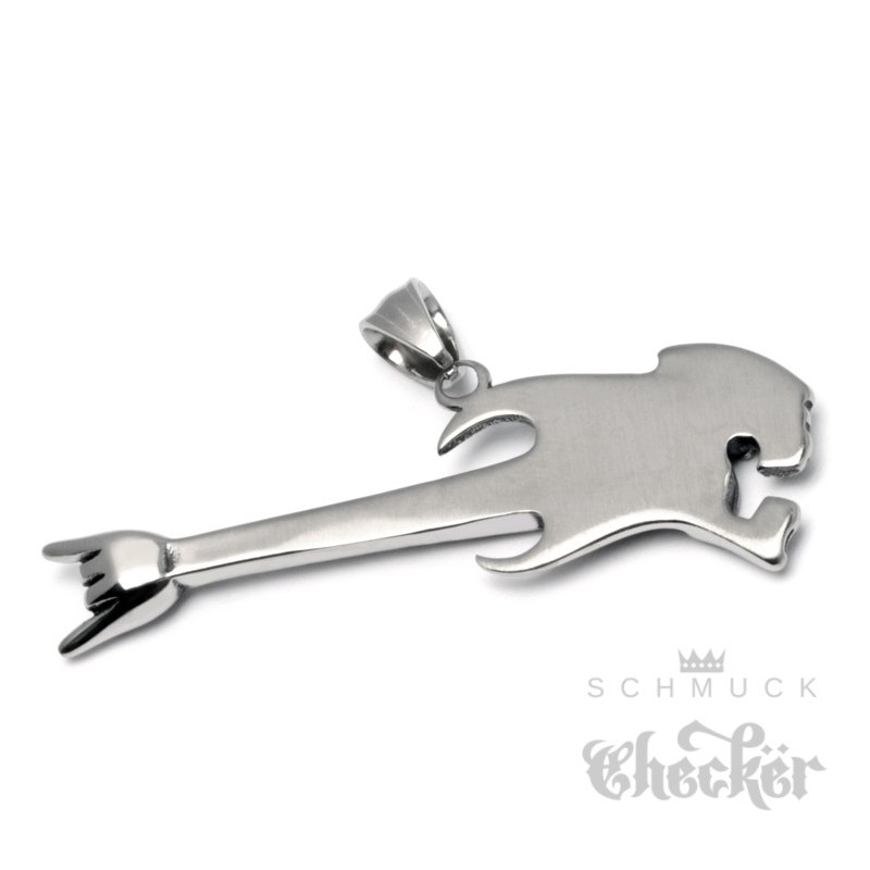 Krass geile Rockgitarre! Der Anhänger stellt eine E-Gitarre dar die von einem lachenden Totenkopf und dem Metal Sign (Pommesgabel) verziert wird. Halskette und Anhänger wurden aus hochwertigem Edelstahl gefertigt und sind damit quasi unzerstörbar. Dieses Schmuckstück ist ein absolutes Muss für jeden Rockmusik-Liebhaber. Jetzt günstig bestellen!