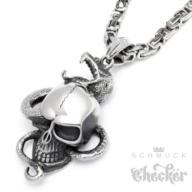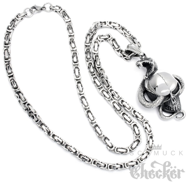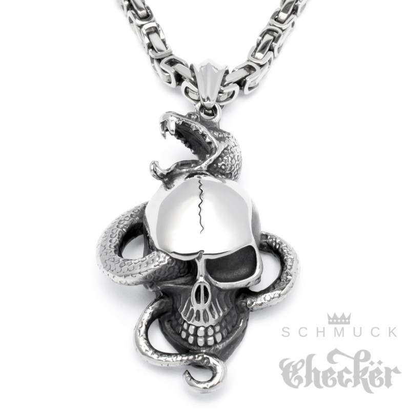 Totenkopf mit Schlange aus Edelstahl Anhänger mit Halskette Königskette Bikerschmuck