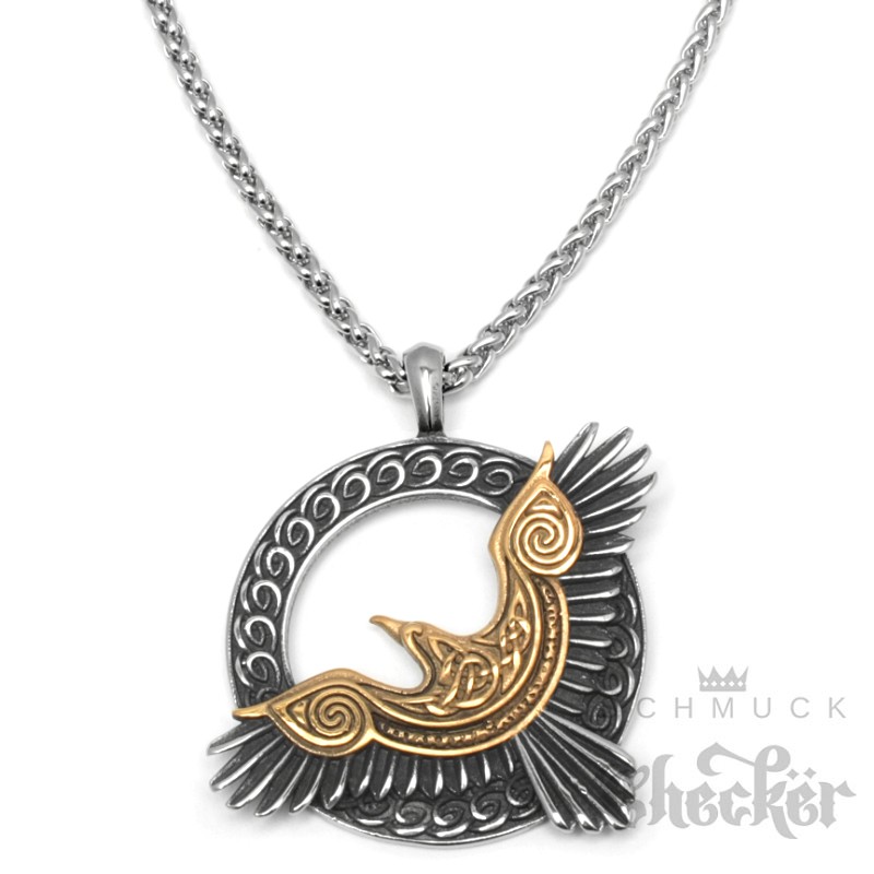 Verziertes Vogel-Amulett silber & gold aus Edelstahl Wikingerschmuck Kettenanhänger