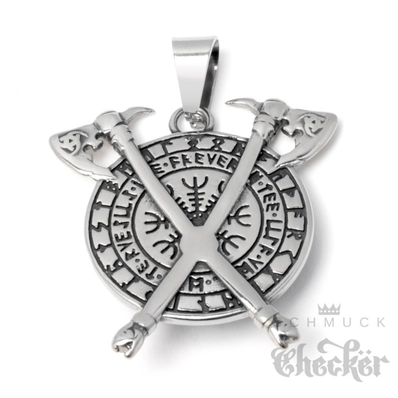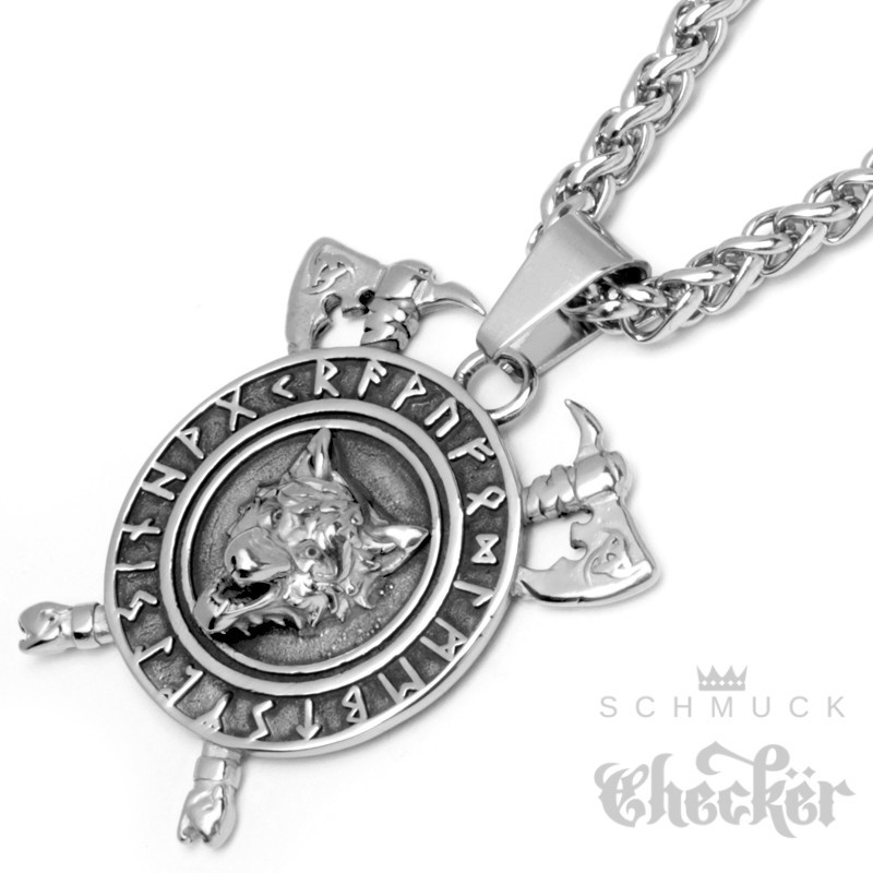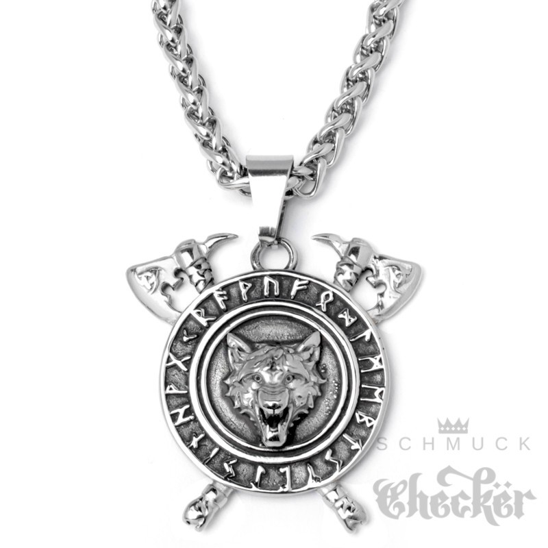 Wikingerschmuck Halskette Wolf mit überkreuzen Äxten und Schutzrunen aus Edelstahl