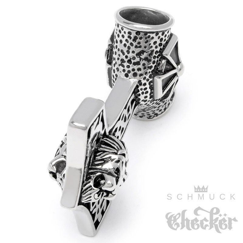 - Motiv: Thor's Hammer mit eisernem Kreuz und Löwenkopf auf keltischen Knoten
