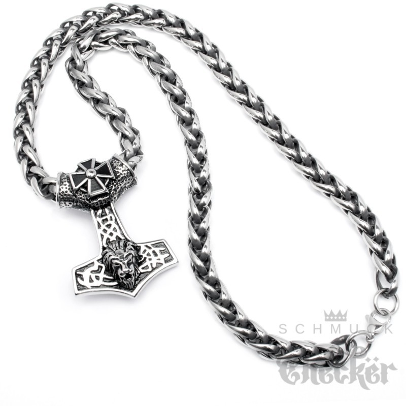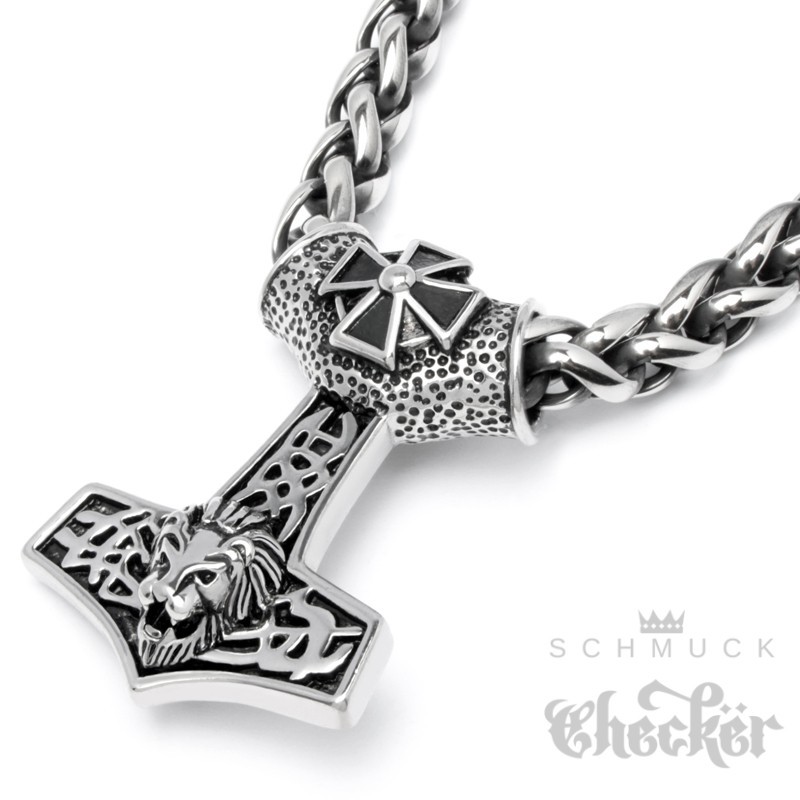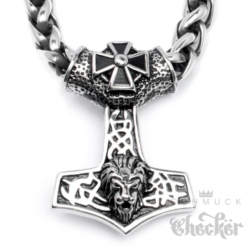 XL massiver Thor Hammer mit Löwenkopf und Eisernem Kreuz aus Edelstahl Bikerschmuck Geschenk