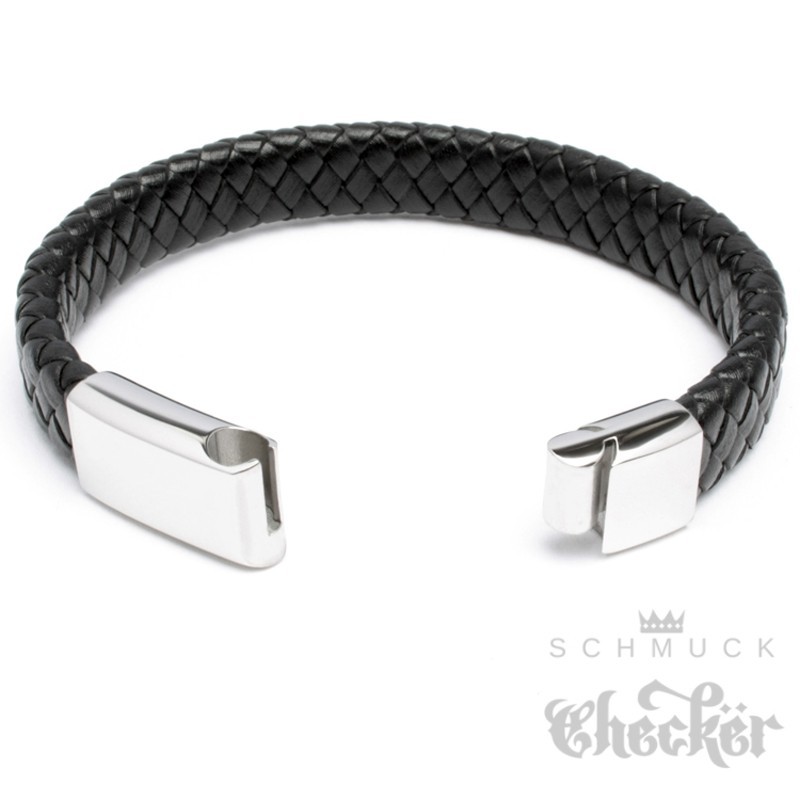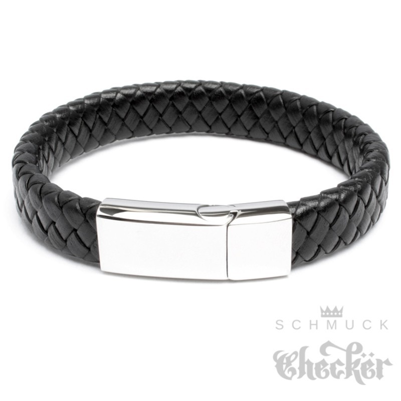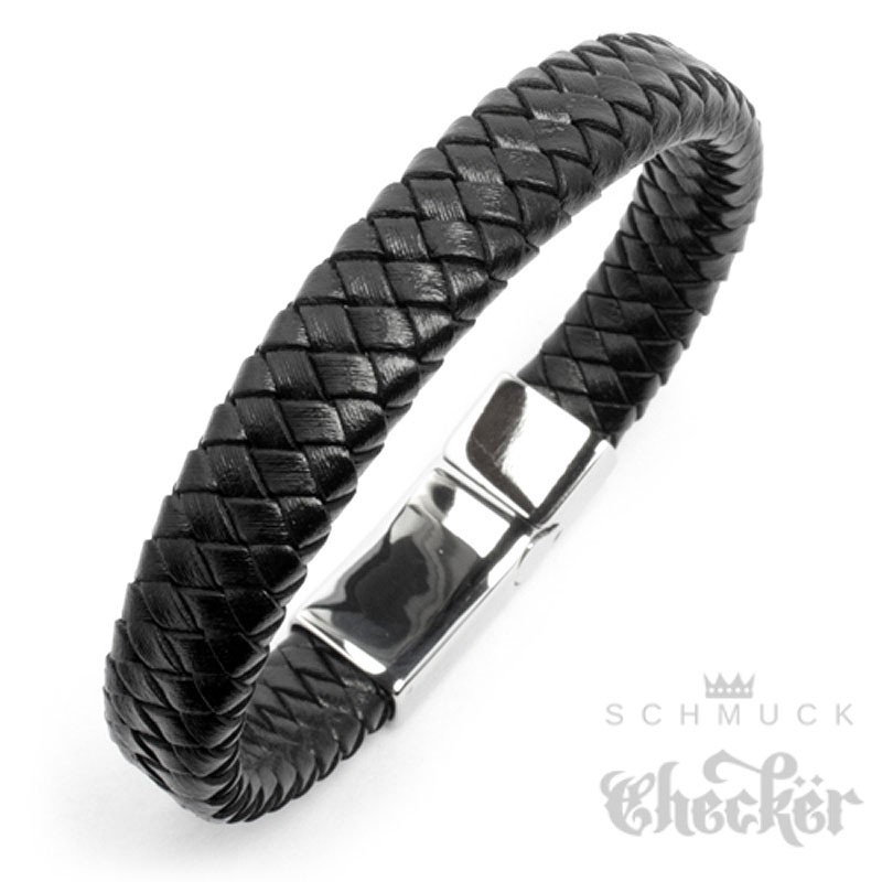 Breites Herren-Armband aus schwarzem Leder geflochten silberner Edelstahlverschluss