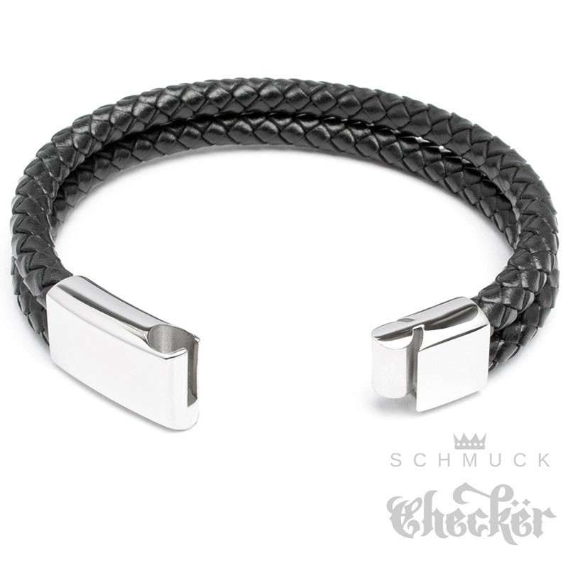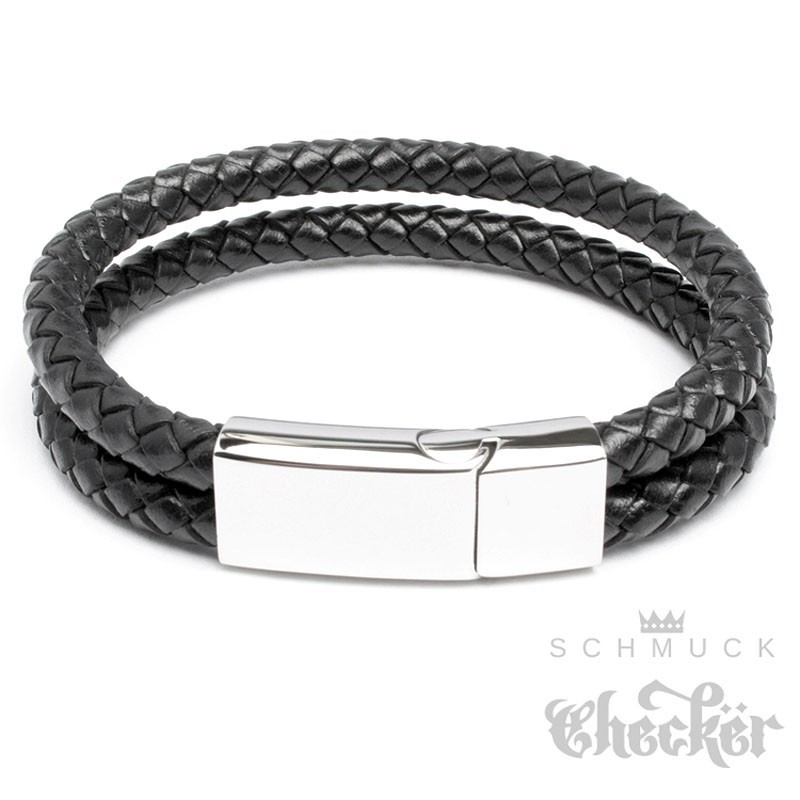 Doppeltes Lederarmband schwarz geflochten Herren-Armband silber Edelstahl Schließe
