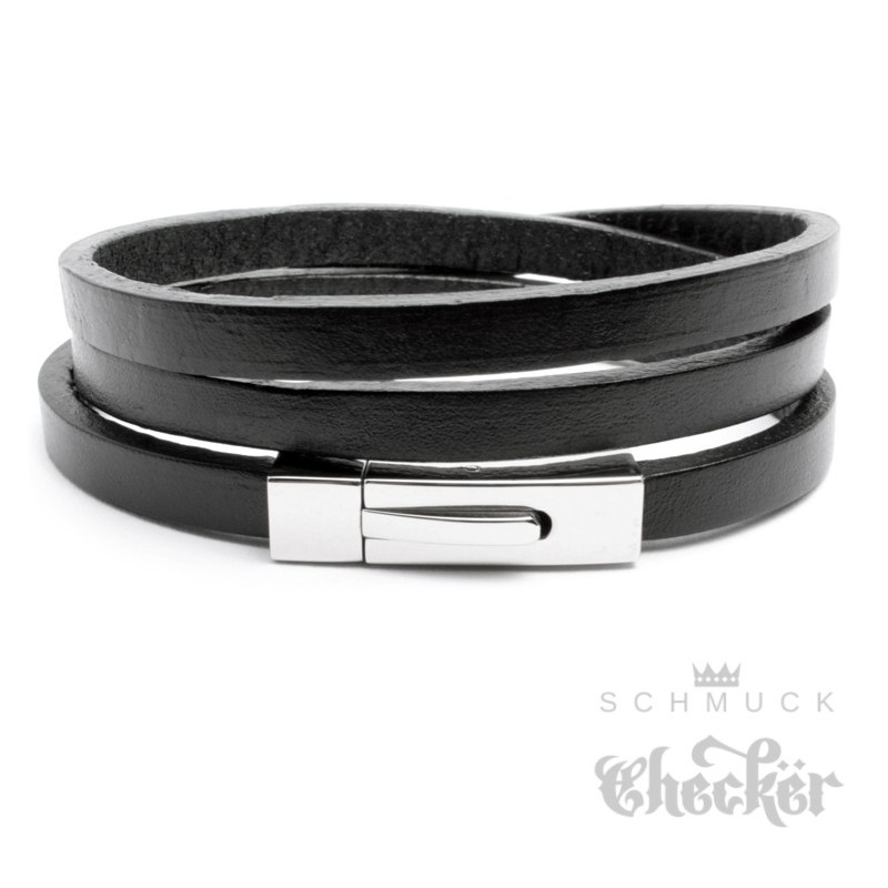 Schlichtes Wickelarmband mit Edelstahlverschluss, garantiert Zeitlos. Dieses hochwertige Lederarmband wird drei mal um das Handgelenk gewickelt und durch einen zuverlässigen Verschluss gesichert. Die Kombination aus schwarzem Leder und silberfarbenem Edelstahl machen dieses Männerarmband zu einem absoluten Klassiker und perfektem Männergeschenk.