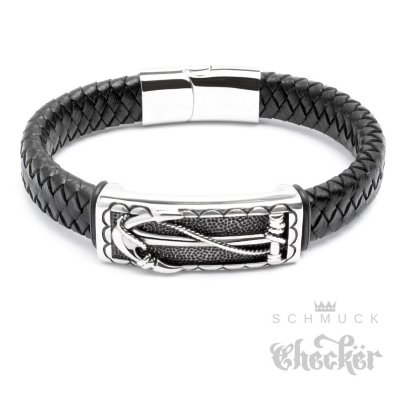 Echt Leder Herren Armband schwarz Edelstahl Anker Seemann Biker Rocker