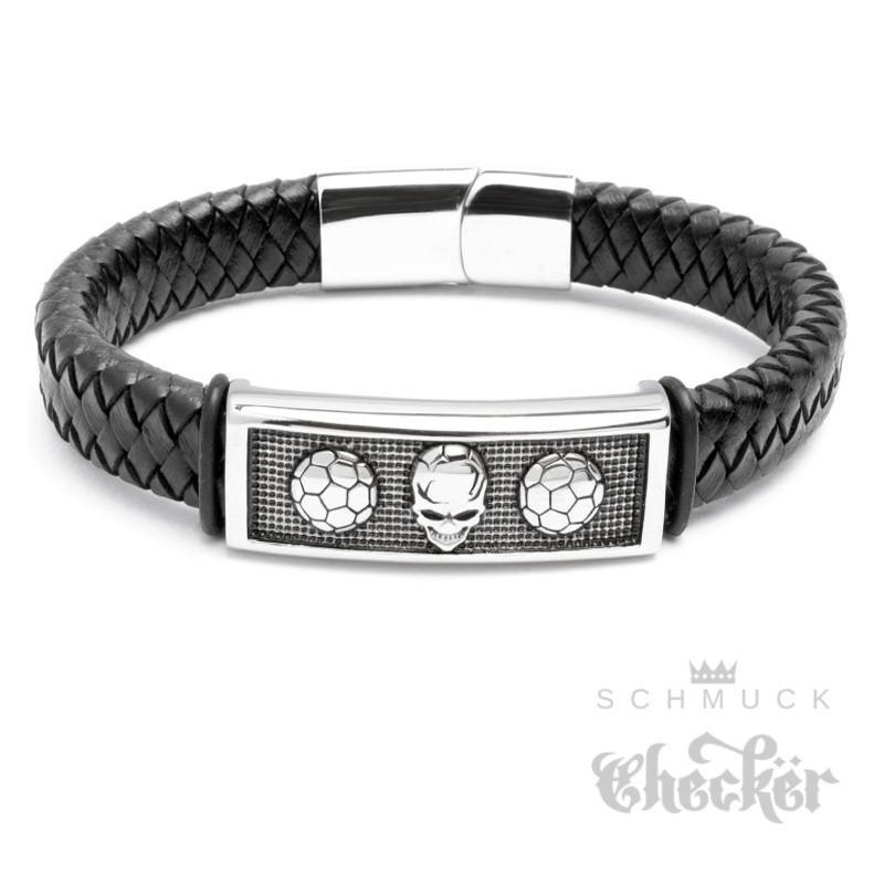Echt Leder Herren Armband schwarz Edelstahl Fußball Hooligans Ultra Totenkopf