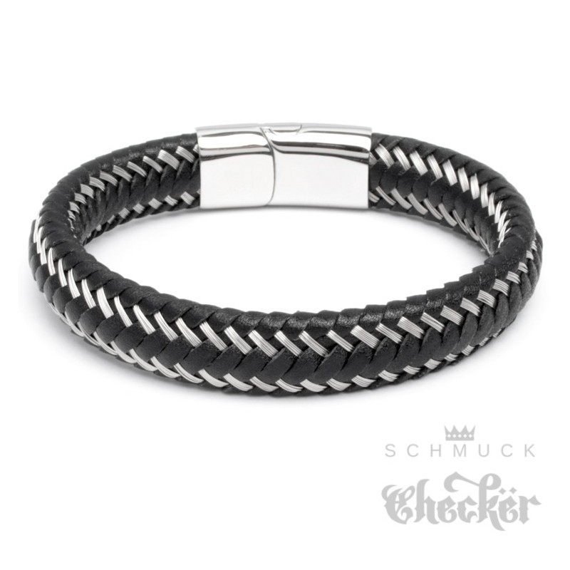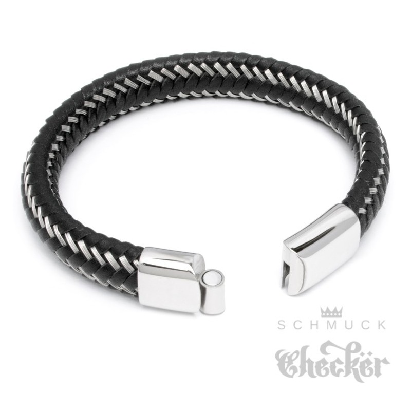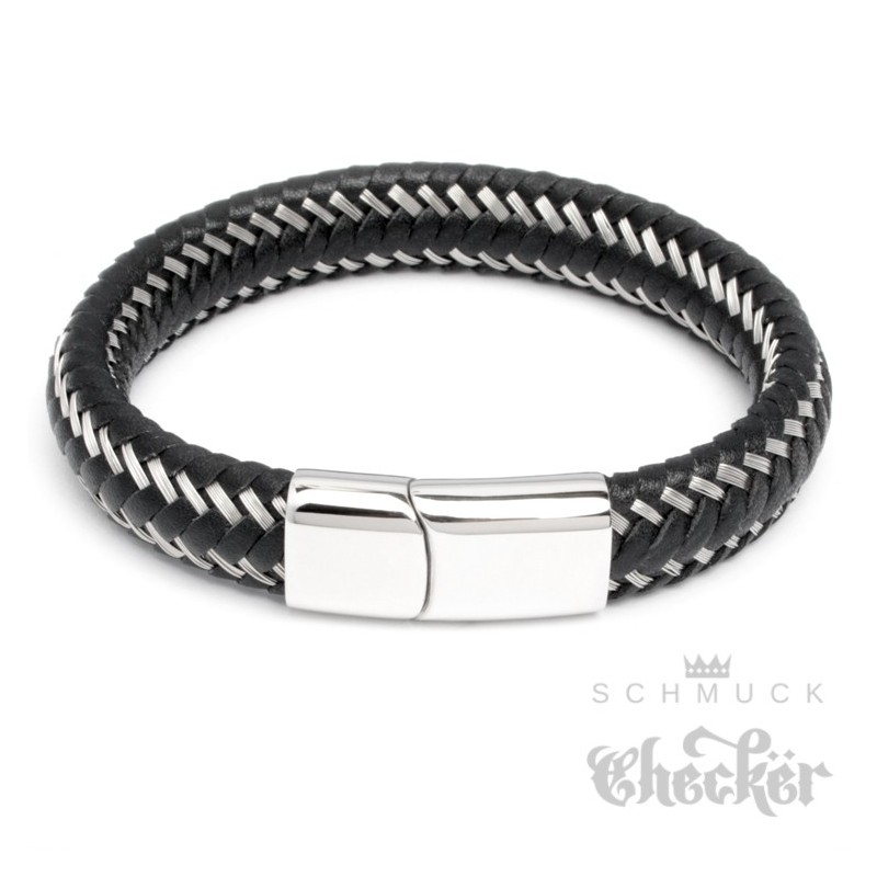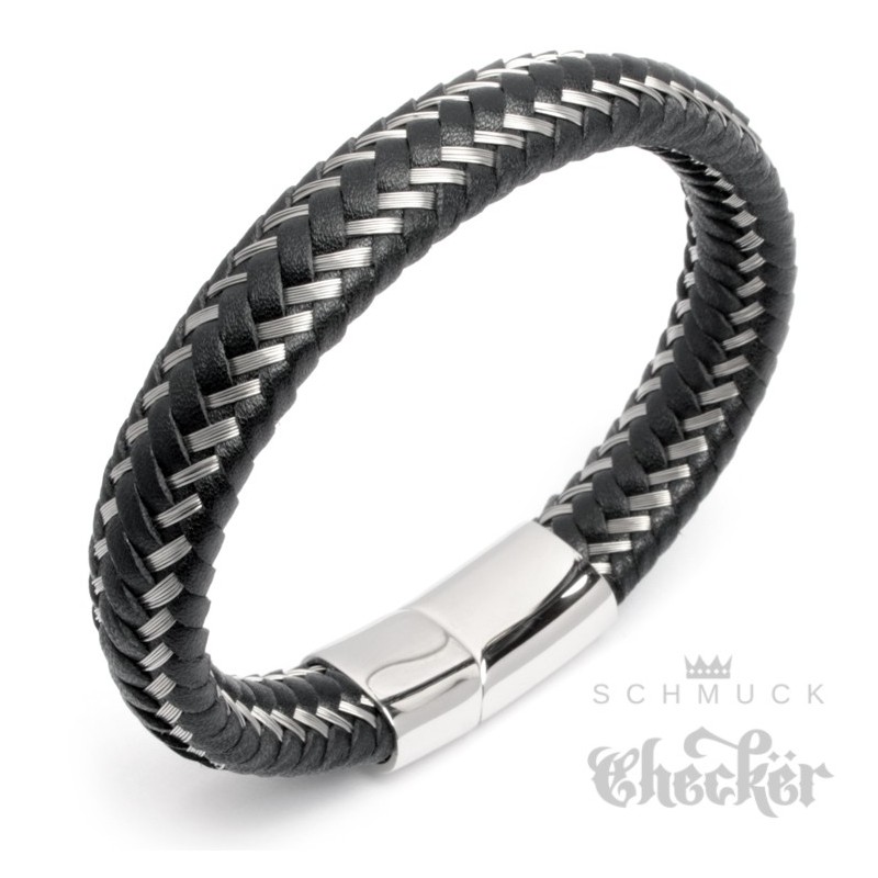 Echt Leder Herren Armband schwarz geflochten Silberfaden Edelstahl Verschluss