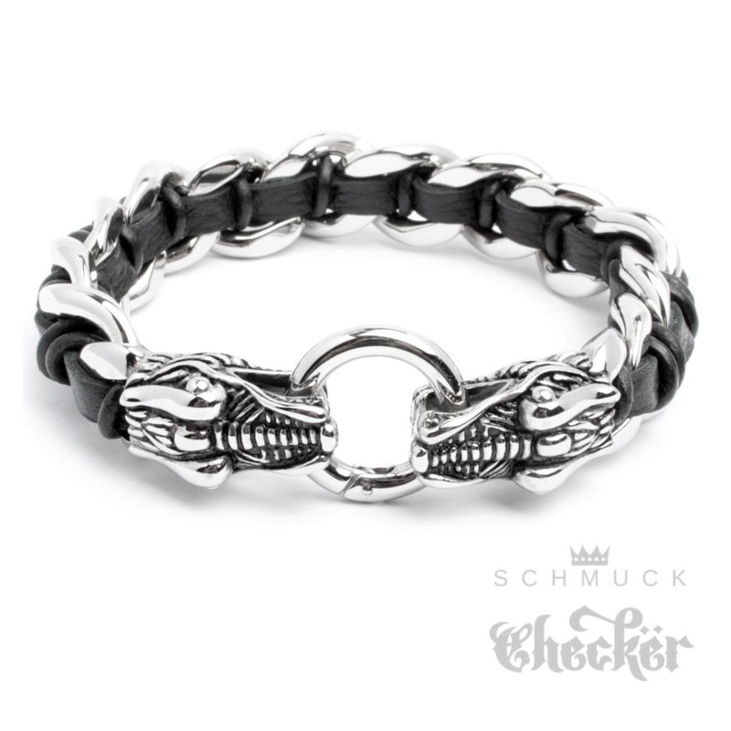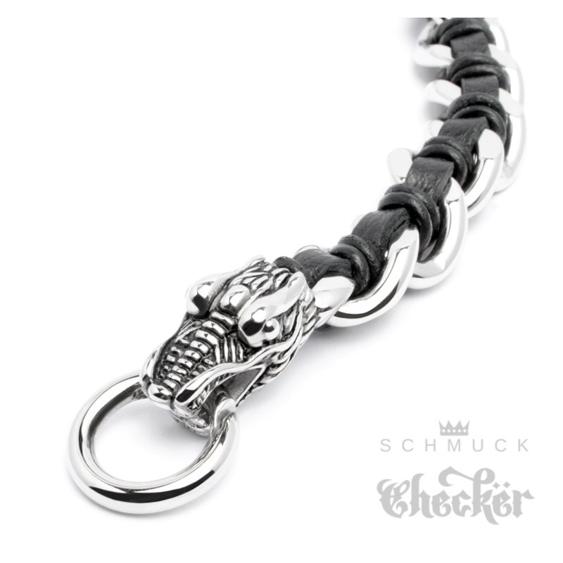 Edelstahl Armband Drache Panzerkette silber echt Leder schwarz Biker
