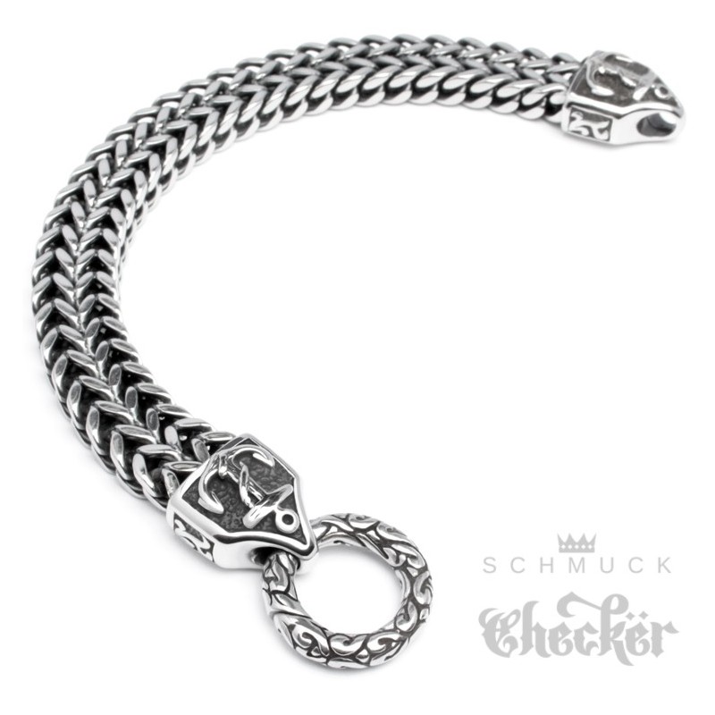 - Das Armband besteht aus vier aneinander geschweißten Panzerketten. Daraus entsteht eine einmalige, interessante und massive Kettenform - eine sogenannte Fuchsschwanzkette.
