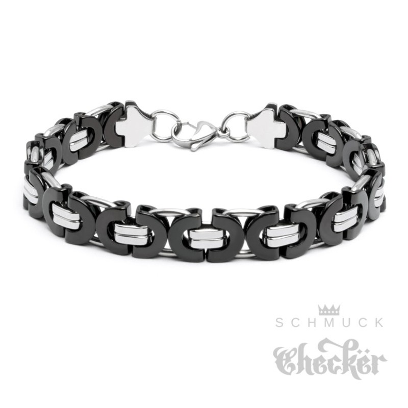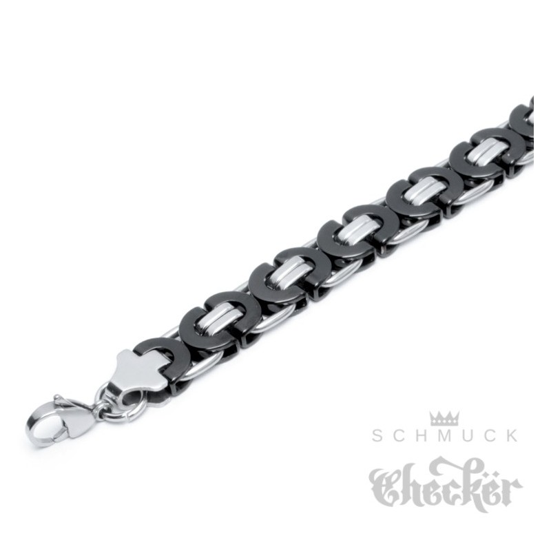 Königsarmband - der Klassiker unter den Männerarmbändern. Diese Armkette besteht aus einer silber & schwarzen Königskette aus Edelstahl. Königsketten sind bei fast allen Männern sehr beliebt. Anders als die klassischen Königsketten ist dieses Armband weniger hoch aber dafür breiter. Damit schmiegt es sich besser an das Handgelenk an. Das macht dieses Herrenarmband zu einem perfekten Geschenk.