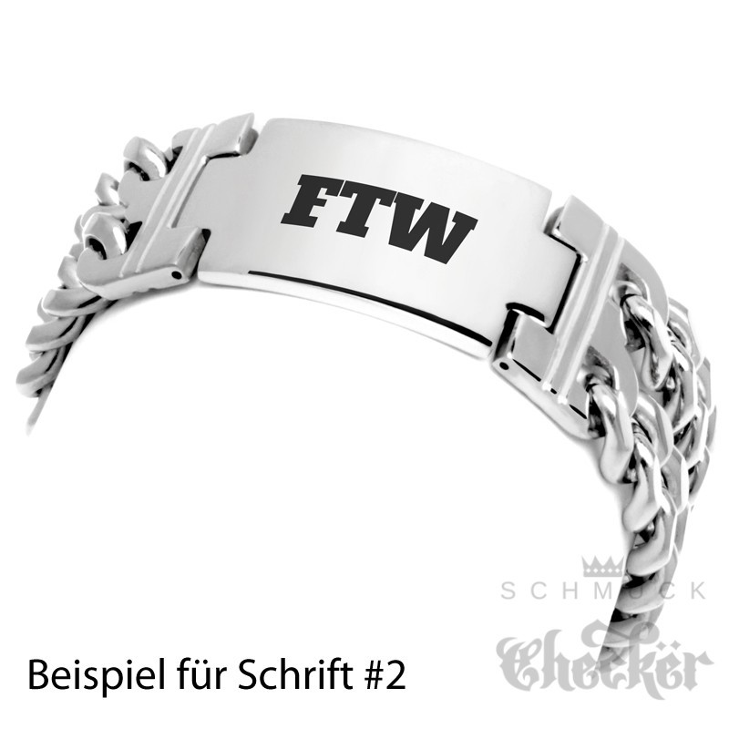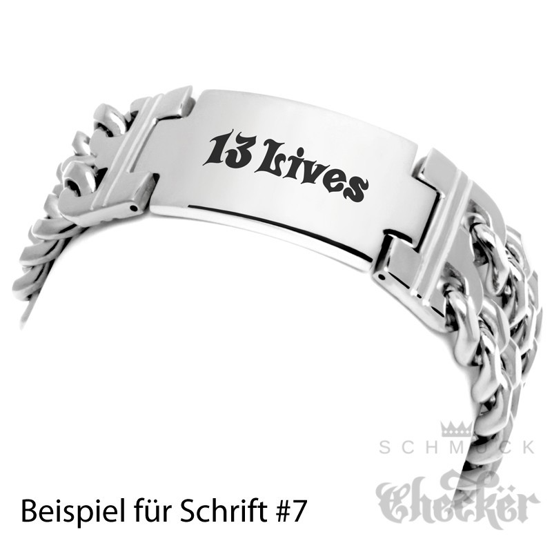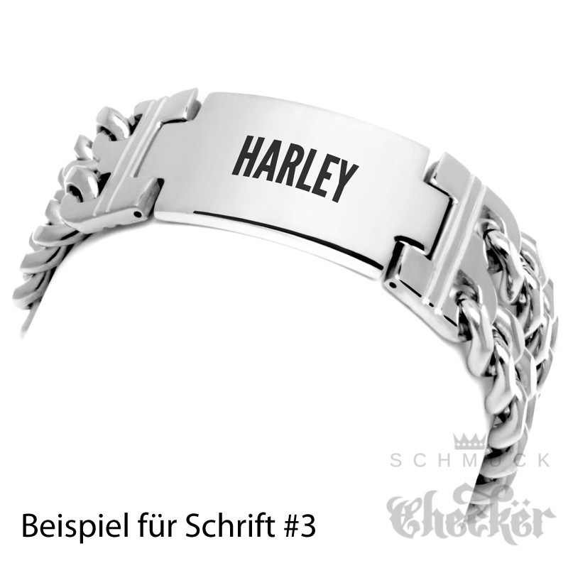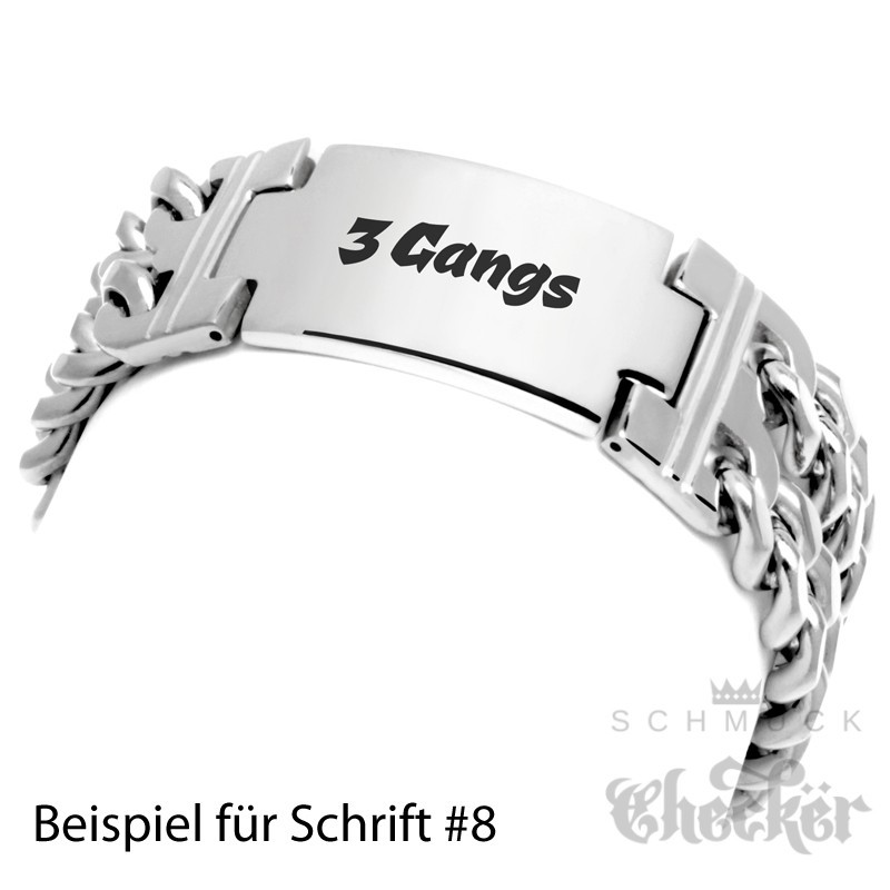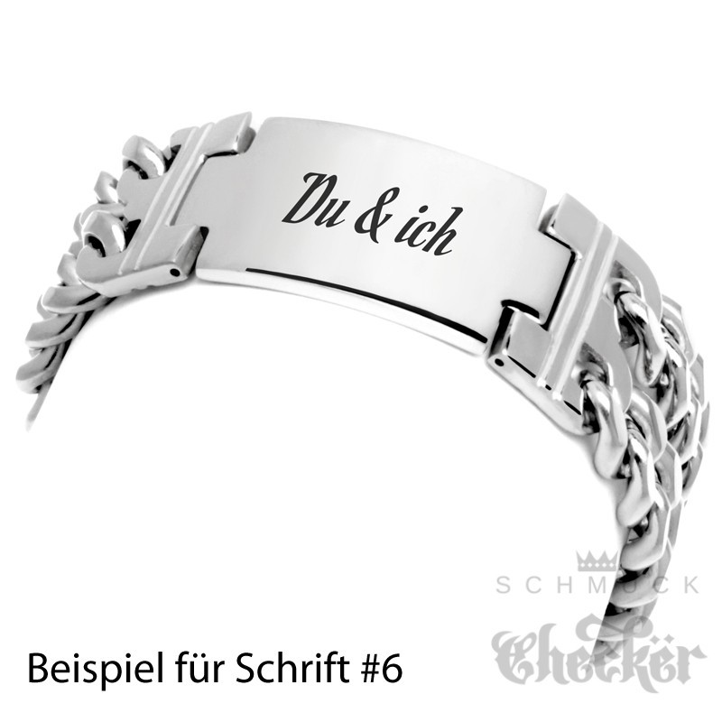 - Form: Doppeltes Panzerarmband mit Schild