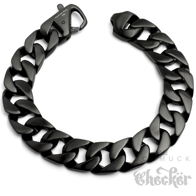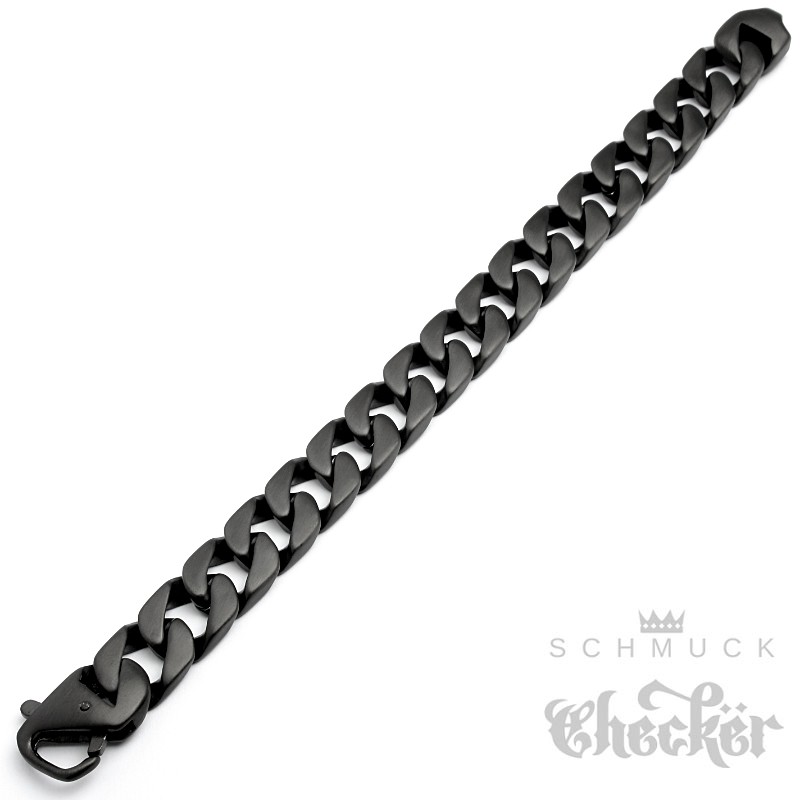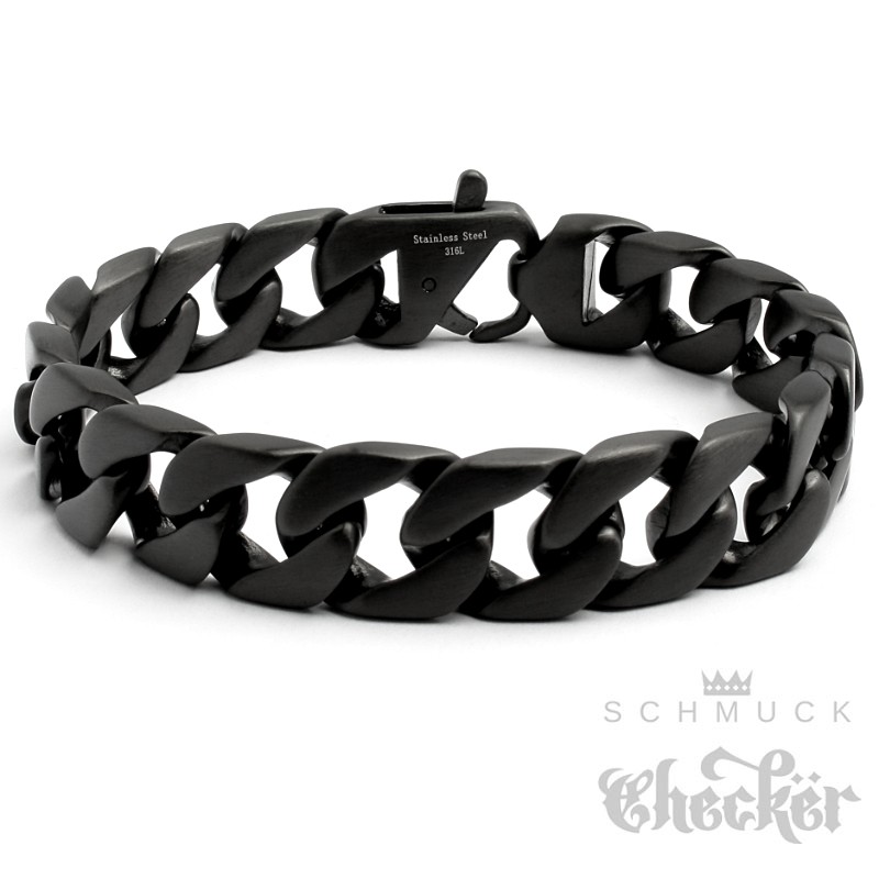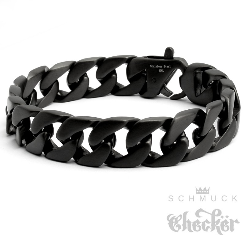 Schwarzes Panzerarmband aus hochwertigem Edelstahl. Die gebürstete Oberfläche verleiht dem Herrenarmband eine ganz besondere Wirkung. Matte Oberflächen sind nicht nur weniger anfällig für Fingerabdrücke und Kratzer, sie lassen Schmuck auch dezenter erscheinen – ganz nach dem Motto „ein Gentleman genießt und schweigt“. Diese Armkette ist 1,5cm breit und kann in verschiedenen Längen bestellt werden.