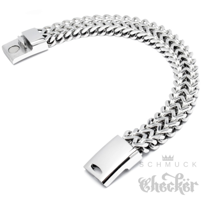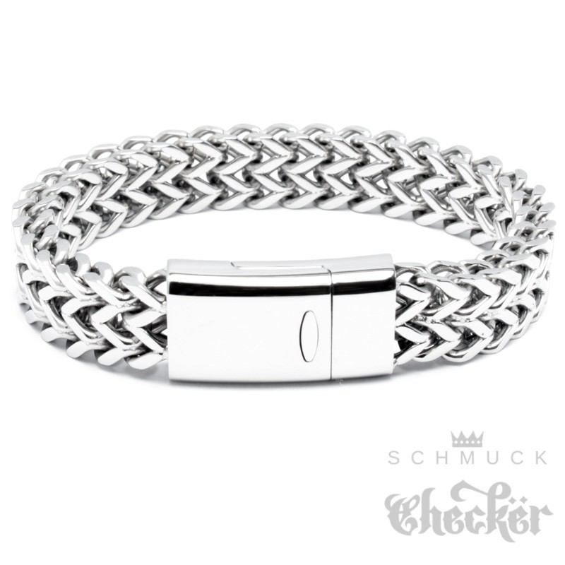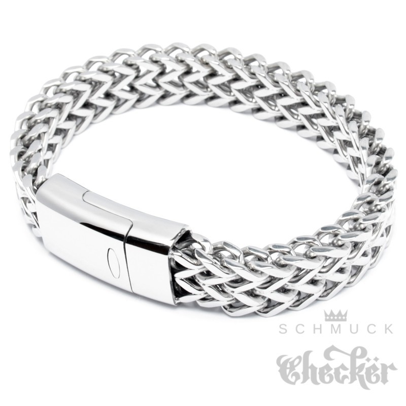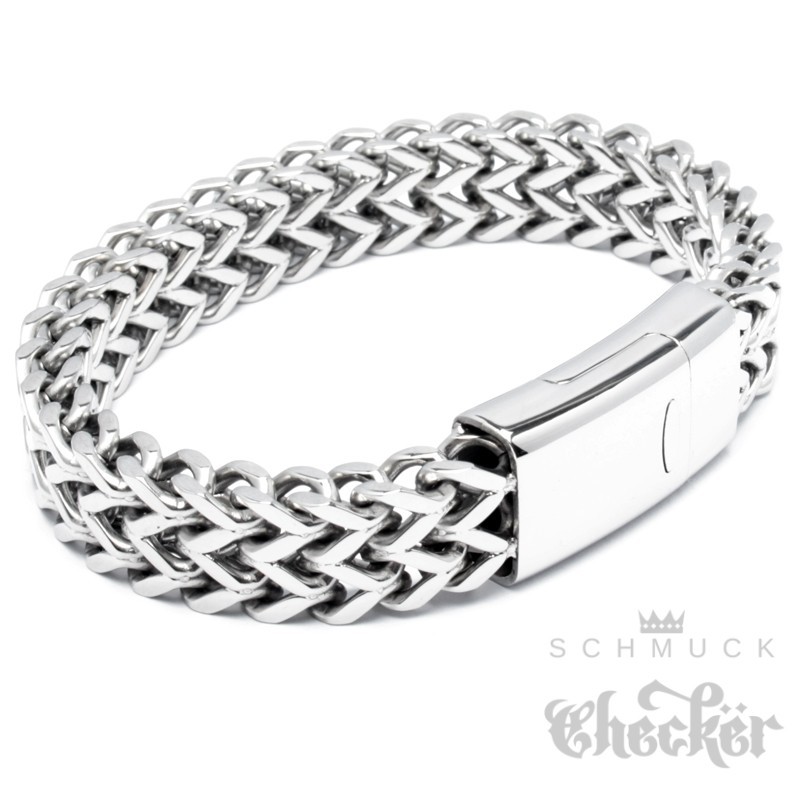 - Das Armband besteht aus vier aneinander geschweißten Panzerketten. Daraus entsteht eine einmalige, interessante und massive Kettenform - eine sogenannte Fuchsschwanzkette.