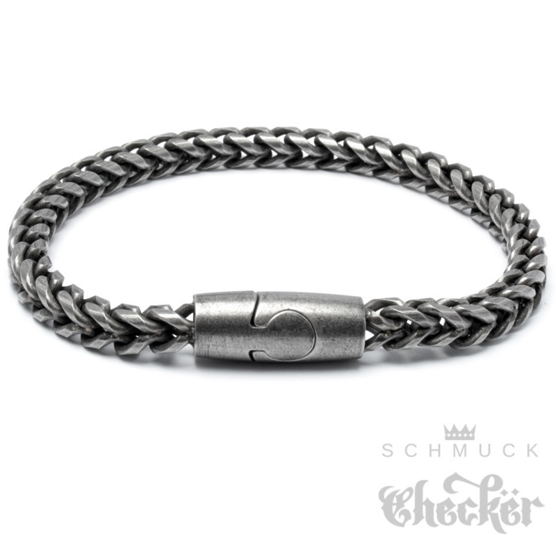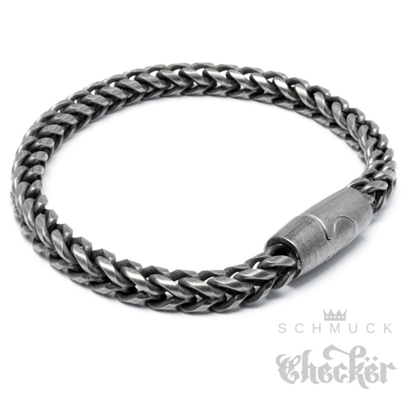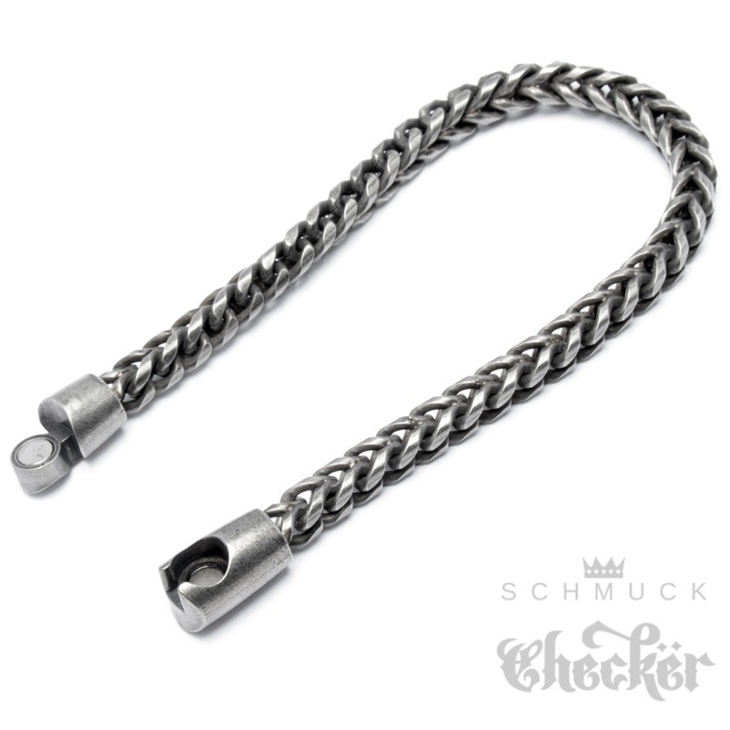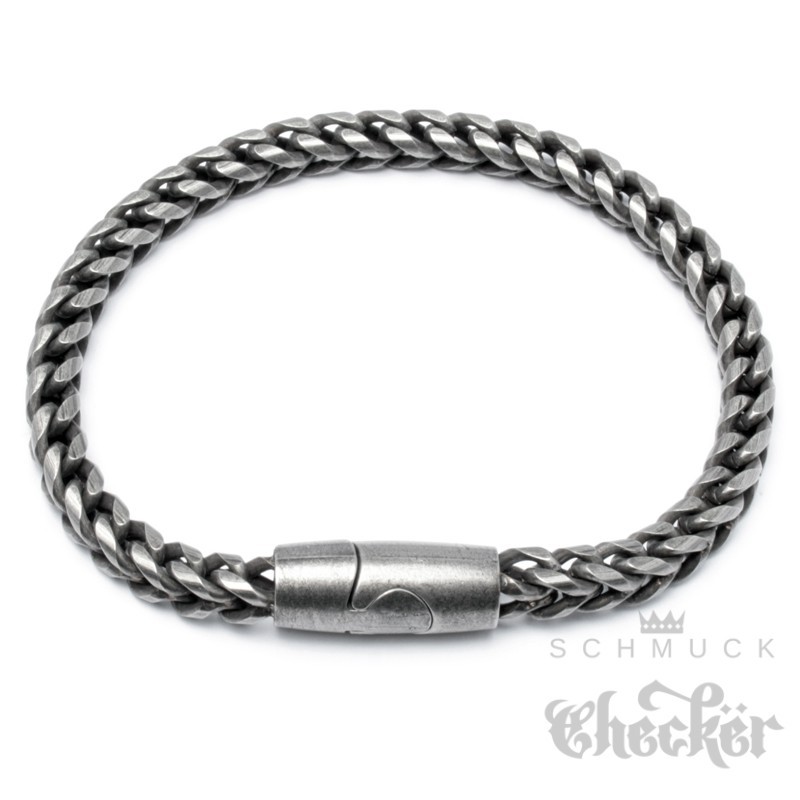 - Das Armband besteht aus zwei aneinandergeschweißten Panzerketten. Daraus entsteht eine einmalige, interessante und massive Kettenform - eine sogenannte Fuchsschwanzkette.