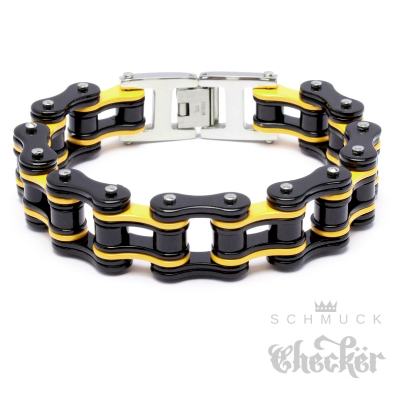 Dieses XL Armband ist das perfekte Accessoire für jeden Biker oder Motorradfahrer. Das Armband besteht aus einer hochwertigen Motorradkette, die aus Edelstahl gefertigt ist. Die Farbkombination schwarz und gelb verleiht dem Armband einen coolen Look. Das Biker-Armband hat einen zuverlässigen Klappverschluss und eine Länge von 21,5 cm sowie eine Breite von 1,6 cm. Es ist sehr hochwertig verarbeitet und eignet sich perfekt als Geschenk für Geburtstage, Valentinstage, Jahrestage, zu Weihnachten oder jeden anderen Anlass. Mit diesem Schmuckstück ziehst Du alle Blicke auf Dich und zeigst Deine Leidenschaft für Motorräder.