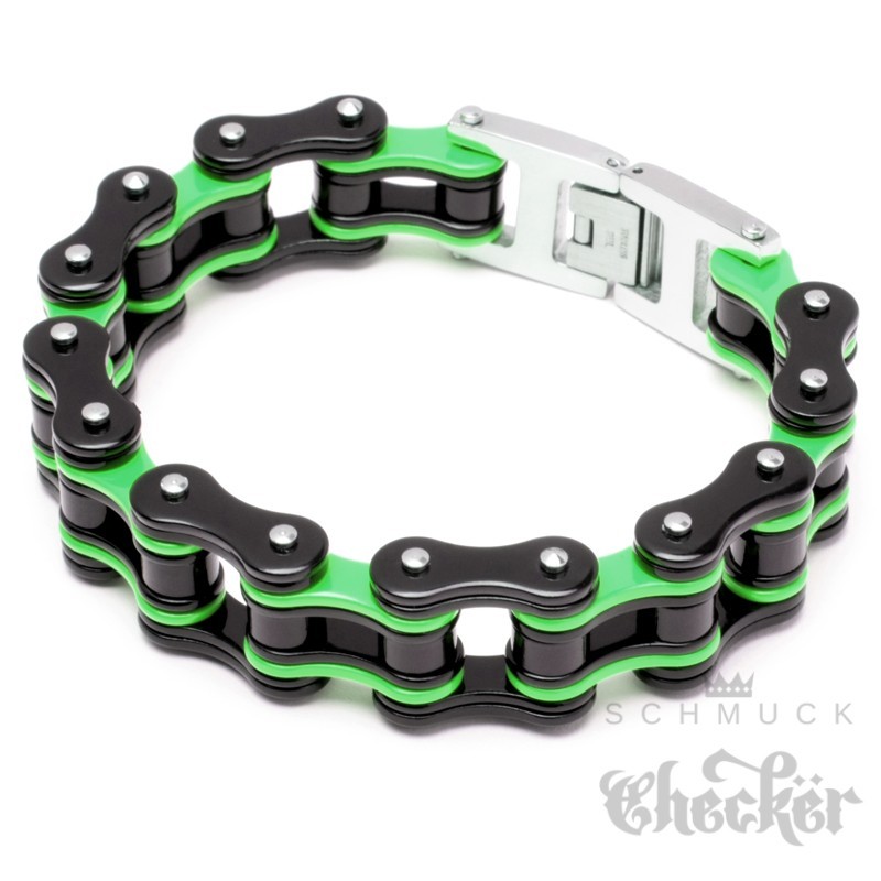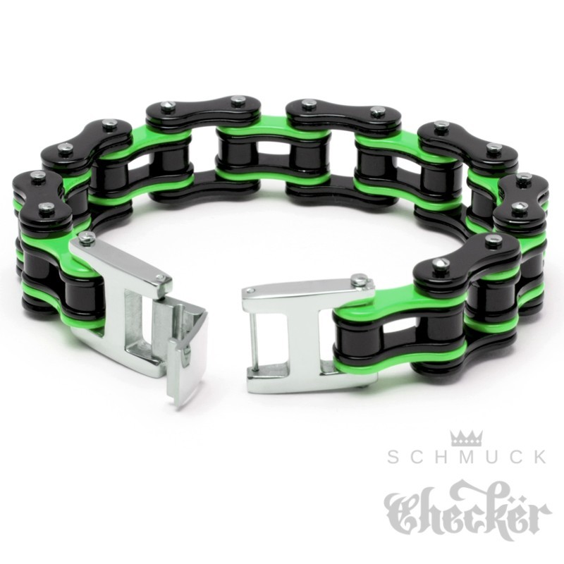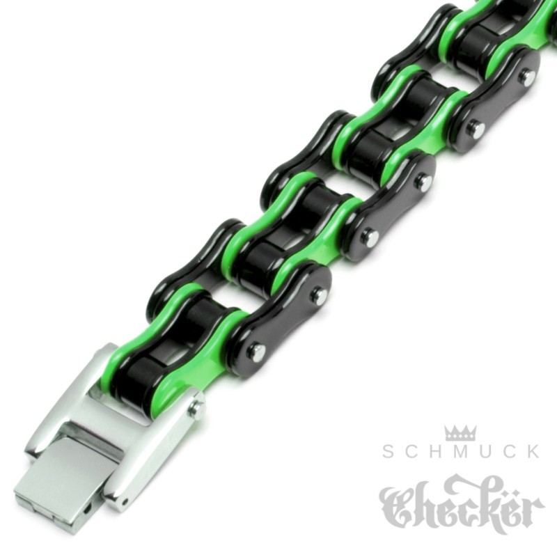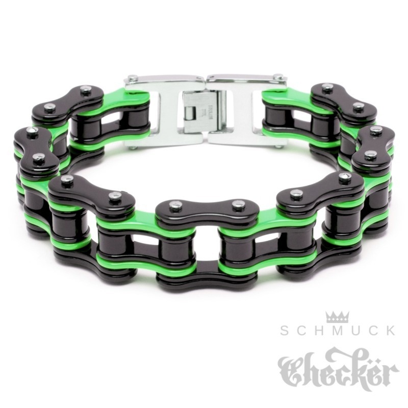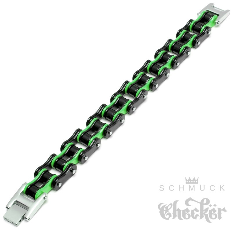 Dieses XL Armband ist das perfekte Accessoire für jeden Biker oder Motorradfahrer. Das Armband besteht aus einer hochwertigen Motorradkette, die aus Edelstahl gefertigt ist. Die Farbkombination schwarz und grün verleiht dem Armband einen coolen Look. Das Biker-Armband hat einen zuverlässigen Klappverschluss und eine Länge von 21,5 cm sowie eine Breite von 1,6 cm. Es ist sehr hochwertig verarbeitet und eignet sich perfekt als Geschenk für Geburtstage, Valentinstage, Jahrestage, zu Weihnachten oder jeden anderen Anlass. Mit diesem Schmuckstück ziehst Du alle Blicke auf Dich und zeigst Deine Leidenschaft für Motorräder.