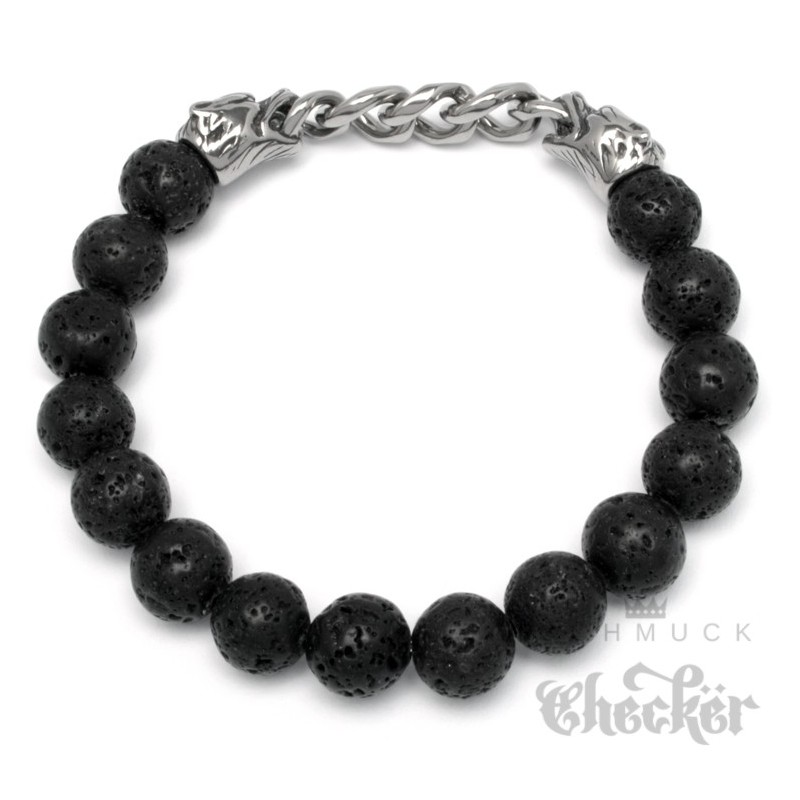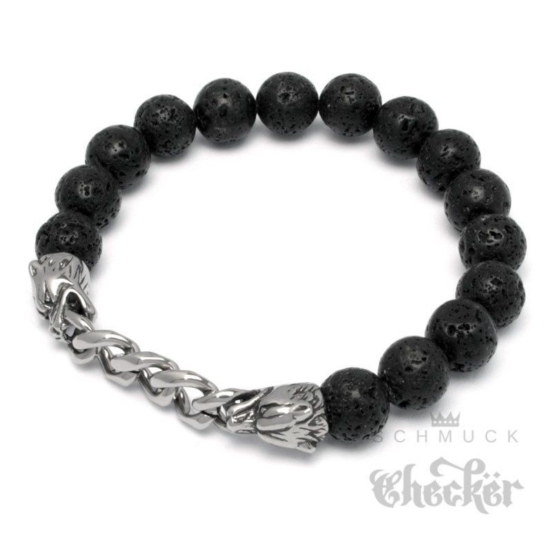 Perlen Bead Armband Lavastein schwarz silber Wolf Männer Panzerarmband Bikerschmuck
