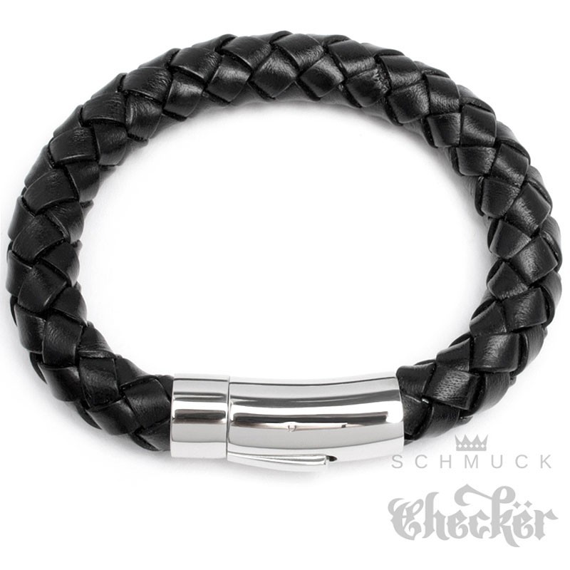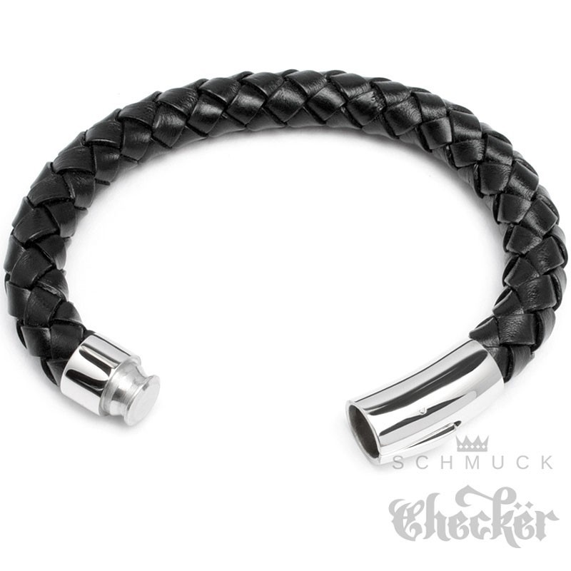 Dickes Lederarmband für Männer. Dieses Armband besteht aus schwarzem, geflochtenen Leder und hochwertigem 316L Edelstahl. Mit seinen stolzen 10mm Durchmesser ist das Männerarmband ein absoluter Hingucker und nichts für schmale Handgelenke. Männerschmuck für echte Kerle.