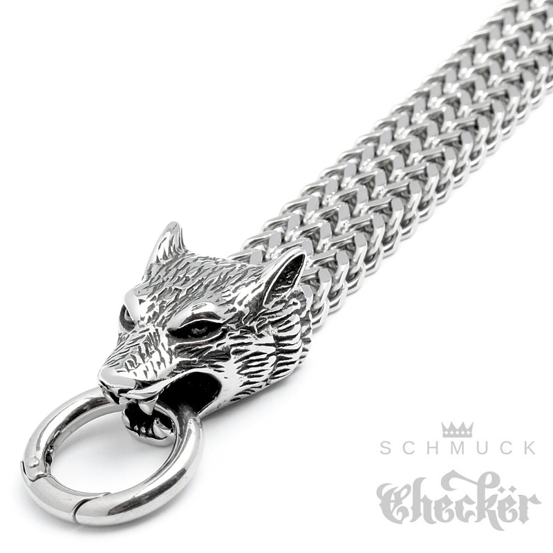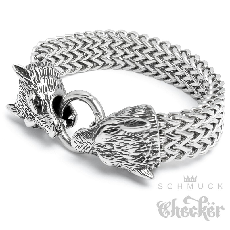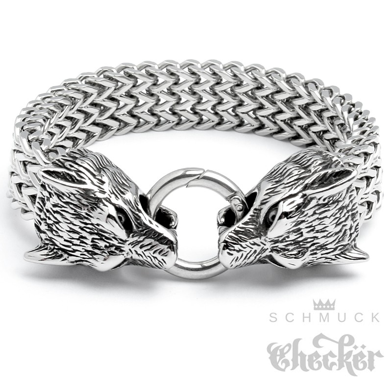 XXL Bikerschmuck Armband mit Wolfsköpfen und Ringverschluss massiver Edelstahl
