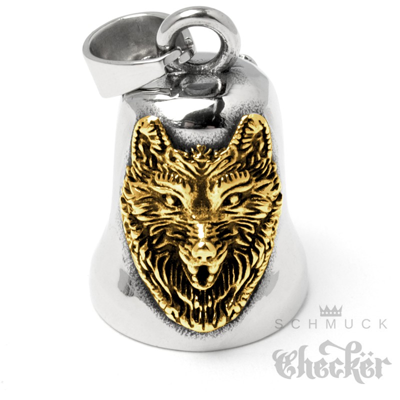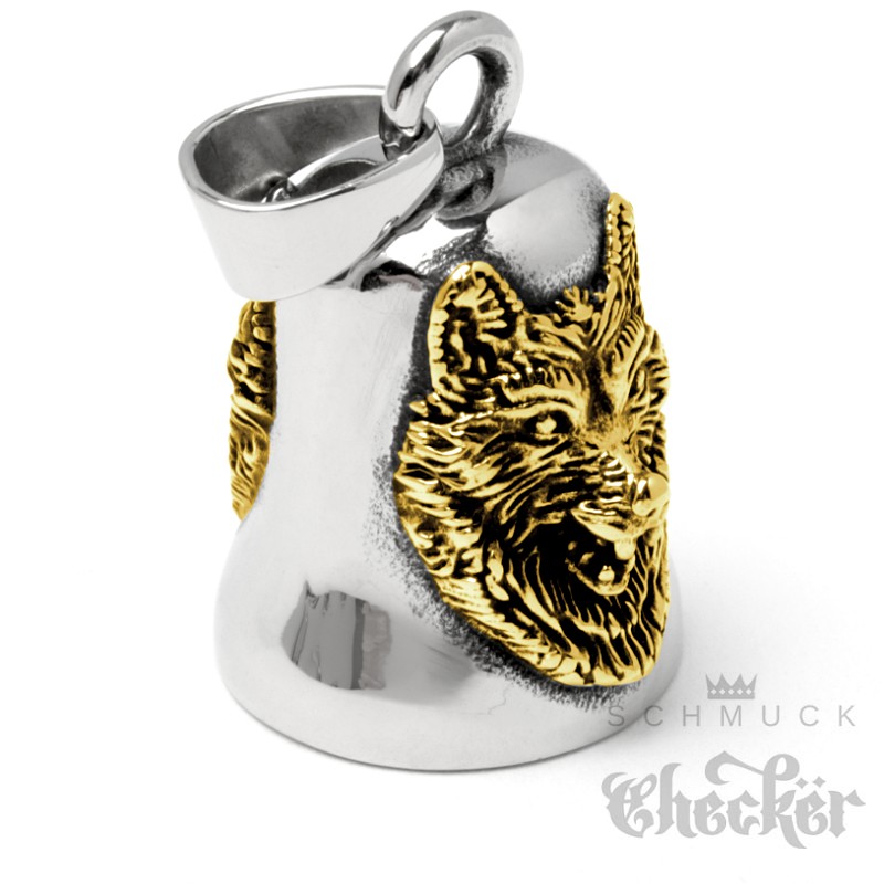 Biker-Bell mit goldenem Wolf aus Edelstahl Motorradfahrer Glücksbringer Geschenk