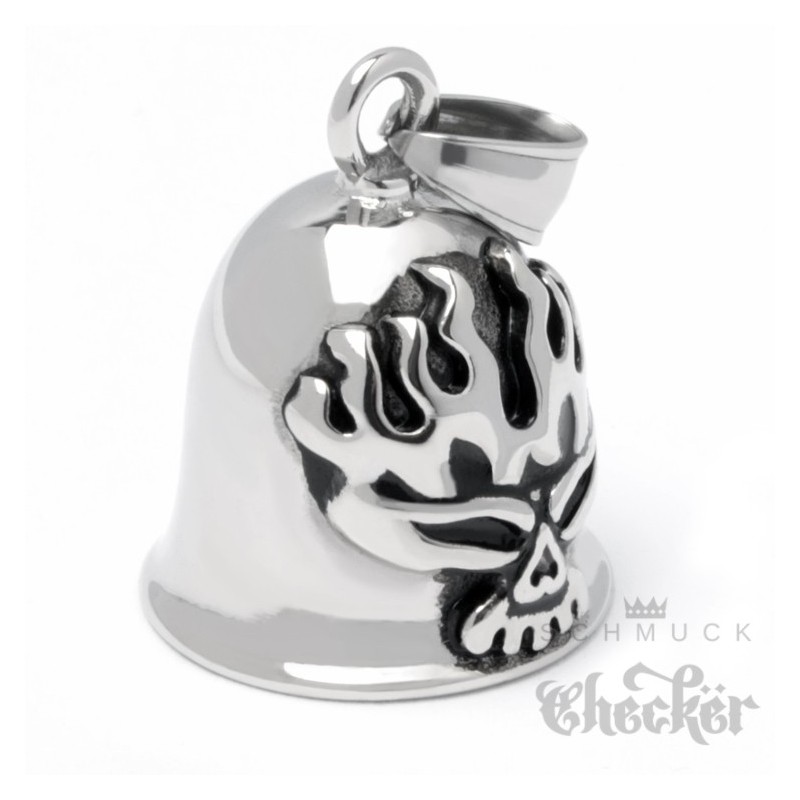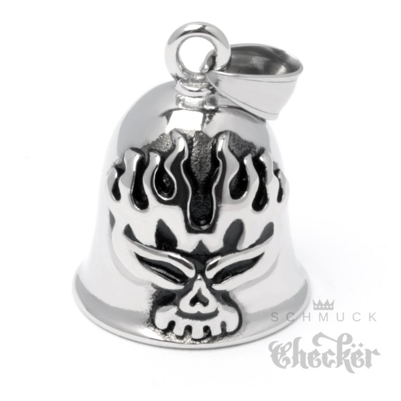 Biker-Bell mit Flammen-Totenkopf aus Edelstahl Motorrad Glücksglocke Skull Schädel