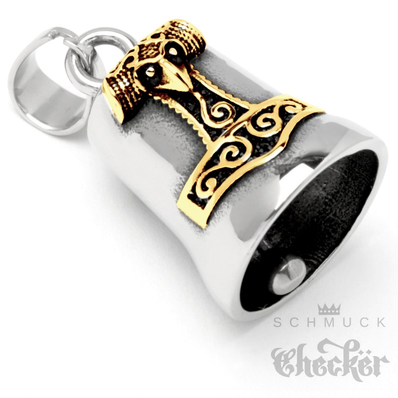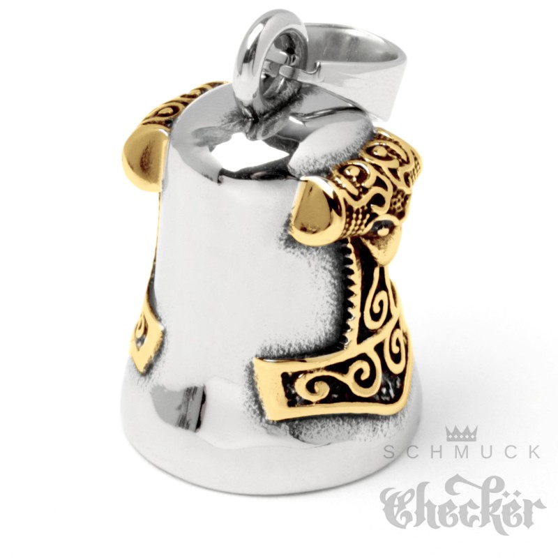 Goldener Thors Hammer Mjölnir auf Biker-Bell Schonenhammer Motorrad Glücksbringer
