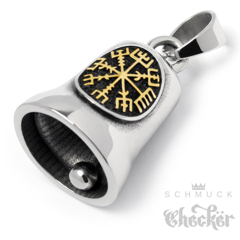 Hochwertige Bikerbell mit goldenem Vegvisir Runenkompass Edelstahl Glücksglöckchen