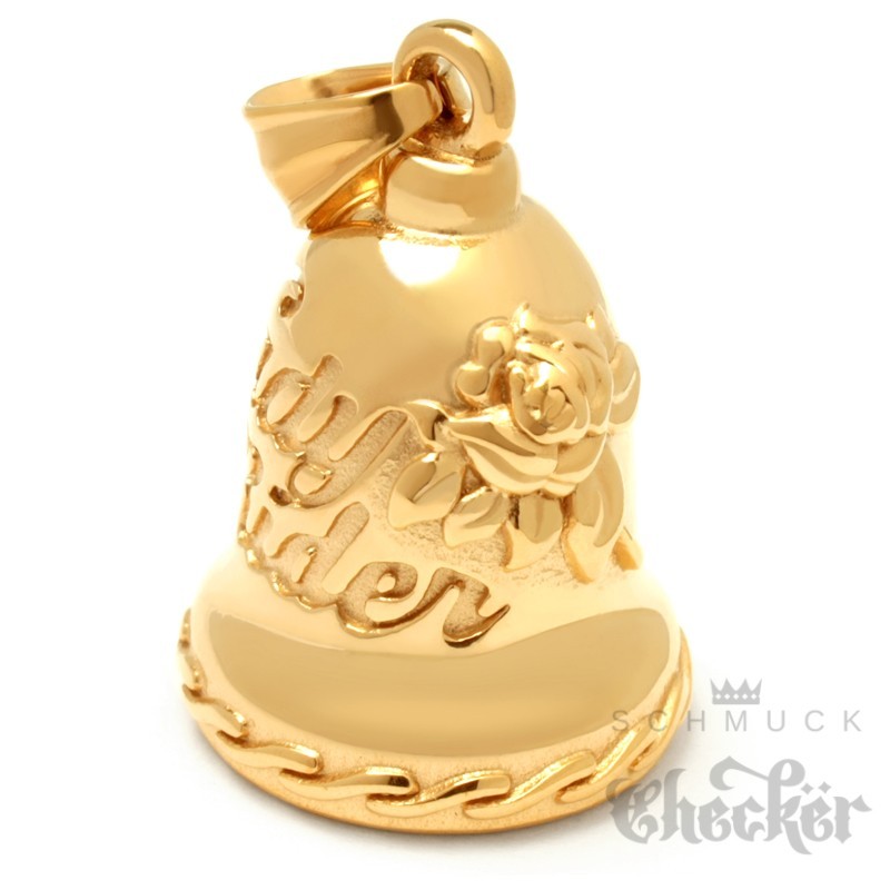 - Die Bikerbell wurde mit aufwendiger Elektrolyse hochwertig vergoldet. Die Goldbeschichtung ist also direkt mit dem Edelstahl verbunden, für maximalen Halt.